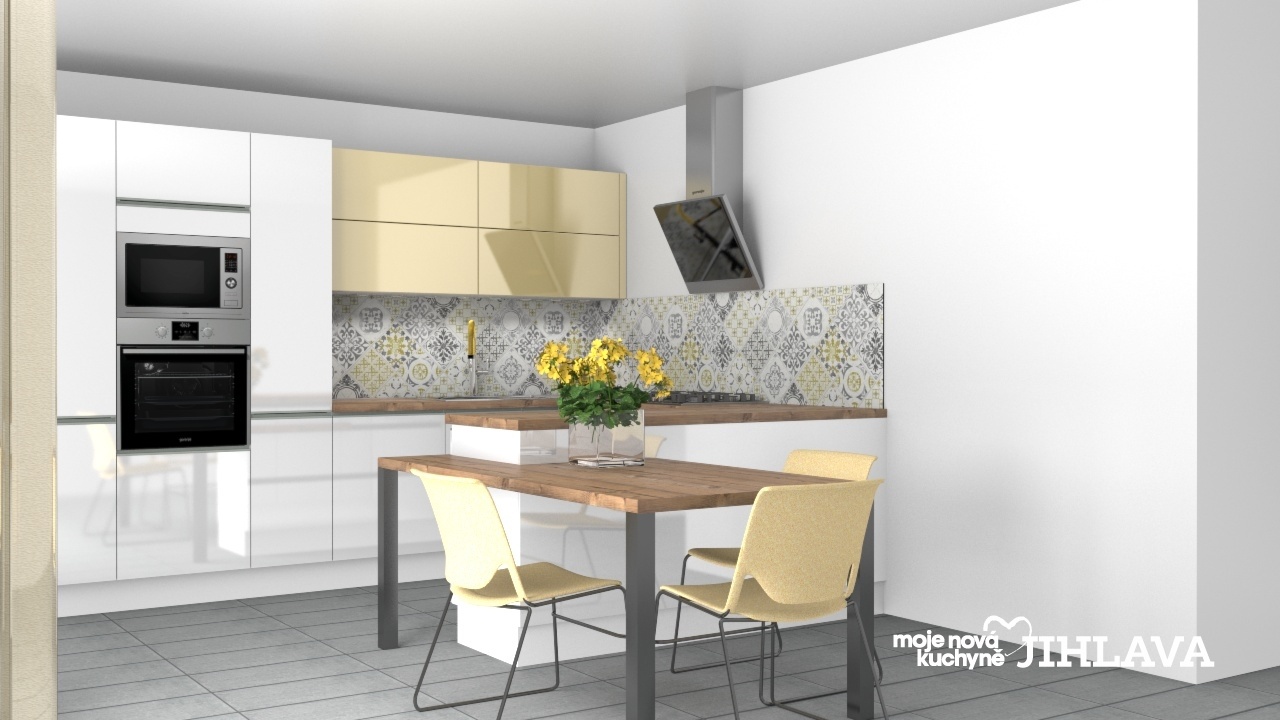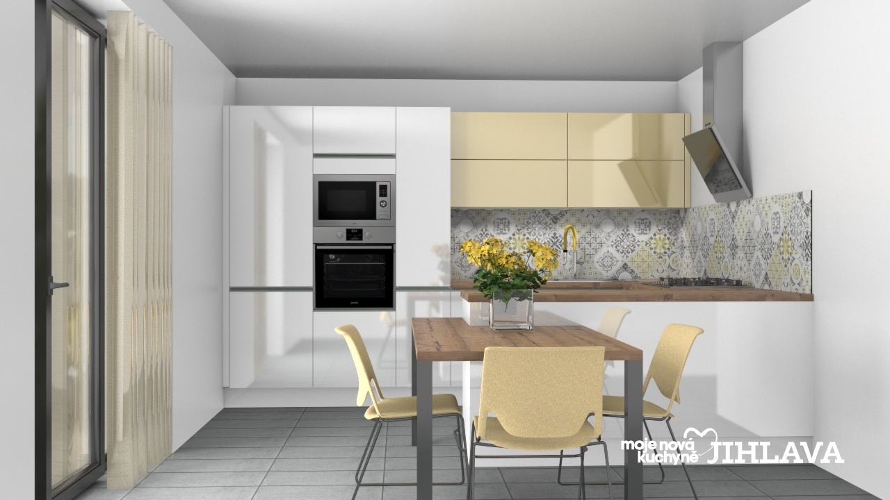 Jednoduchá kuchyně Susann se zafrézovaným úchytem ve vysokém bílém lesku, doplněna moderní žlutou barvou stejné řady.