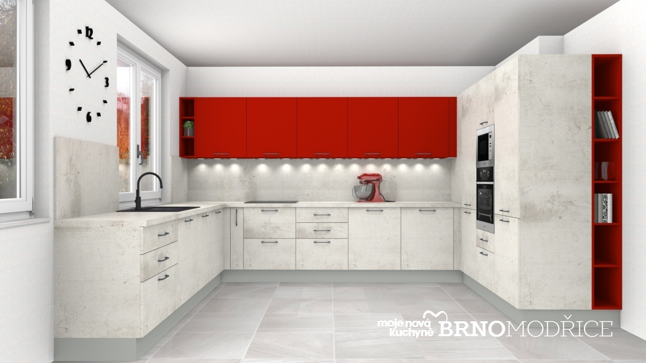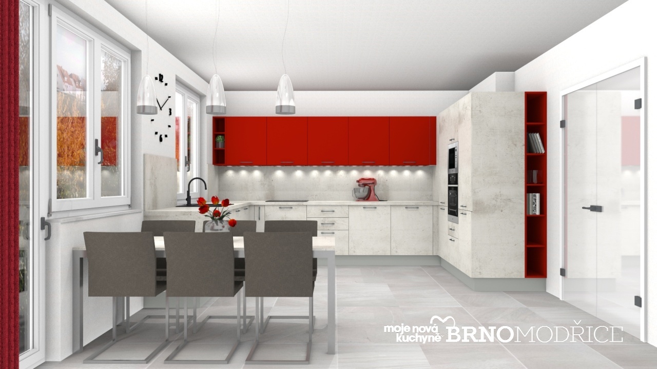 Betonová kuchyně je doplněna výraznějšími červenými horními skříňkami a otevřenou vysokou skříní.