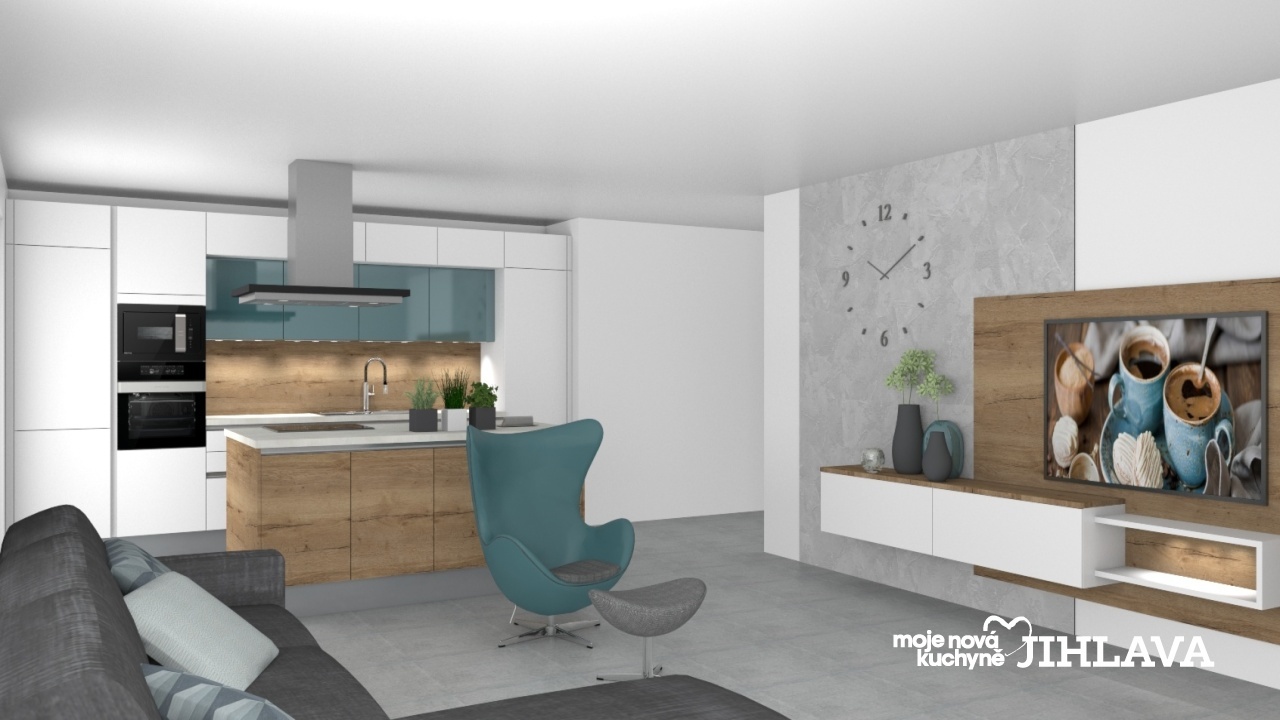 Moderní kuchyně navržena společně s obývacím pokojem. Bílá matná Ella s pastelově modrou Gloriette v kombinaci s tmavším dřevem. Bezúchytový systém Linea Piantra. Pracovní deska z umělého kamene Technistone ve světlém dekoru. Kuchyň je zastavěná téměř do stropu s maximálním využitím úložných prostor.