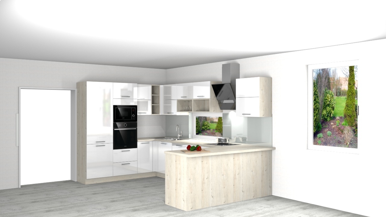 Kuchyně začíná sestavou dvou vysokých skříní pro vestavné spotřebiče (lednici, troubu a mikrovlnou troubou). Mezi mycím koutem v rohu a varnou deskou je dostatečná pracovní plocha, která je i po pravé straně ve vybíhajícím ostrůvku od zdi, který se skládá ze skřínky s výsuvným systémem a šuplíky.