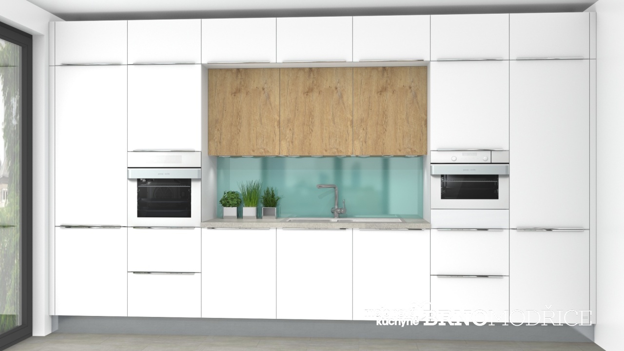 Dřez je koncipovaný u stěny, kde je zasazen mezi vysoké skříně. Vedle dřezu je pak i myčka nádobí.
