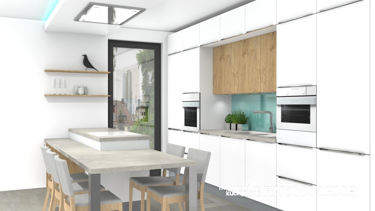 Kuchyně je matná bílá v kombinaci s dubem a pracovní deska je v dekoru světlého betonu.