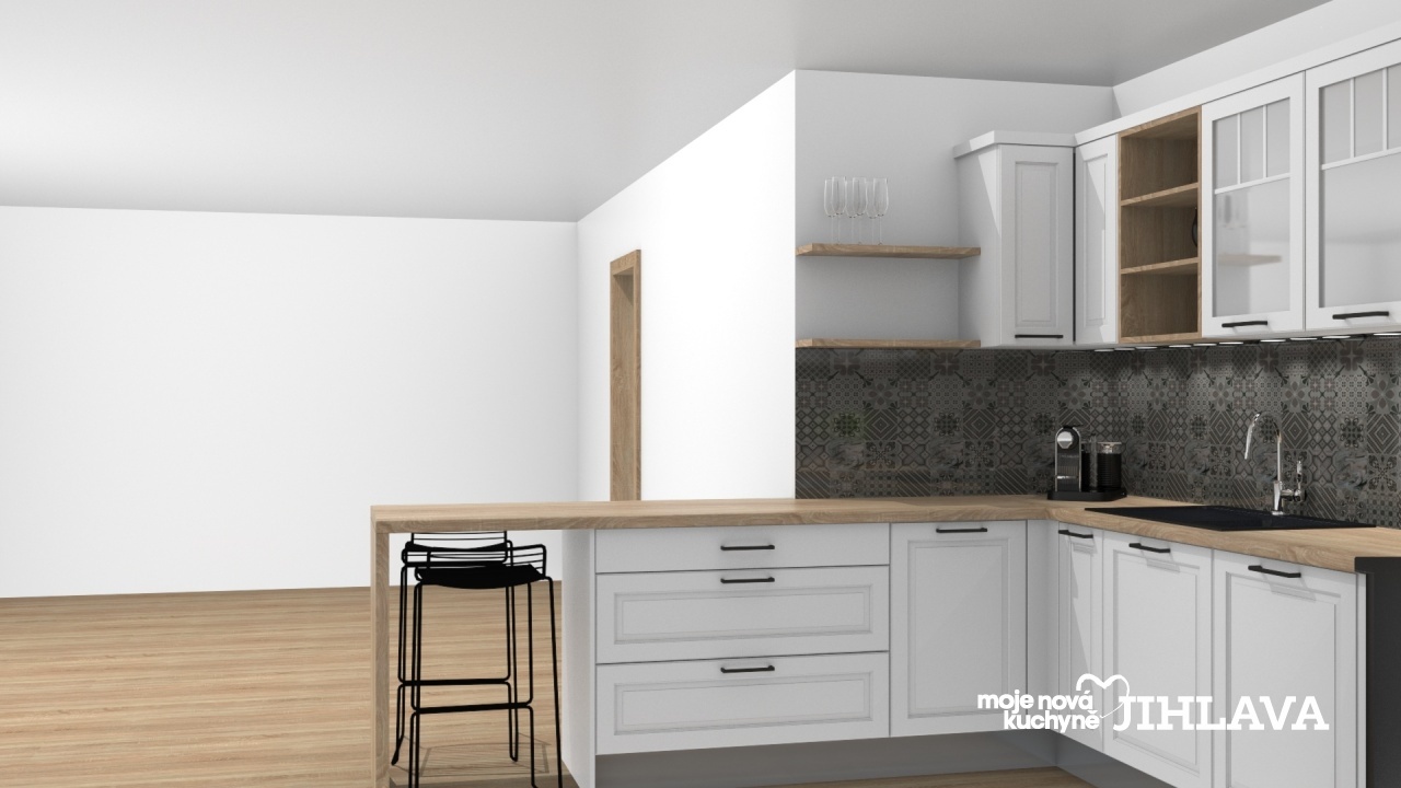 Za kuchyňskou linkou je naplánovaný tmavě šedý obklad, který zvýrazní rustikální vzhled.
