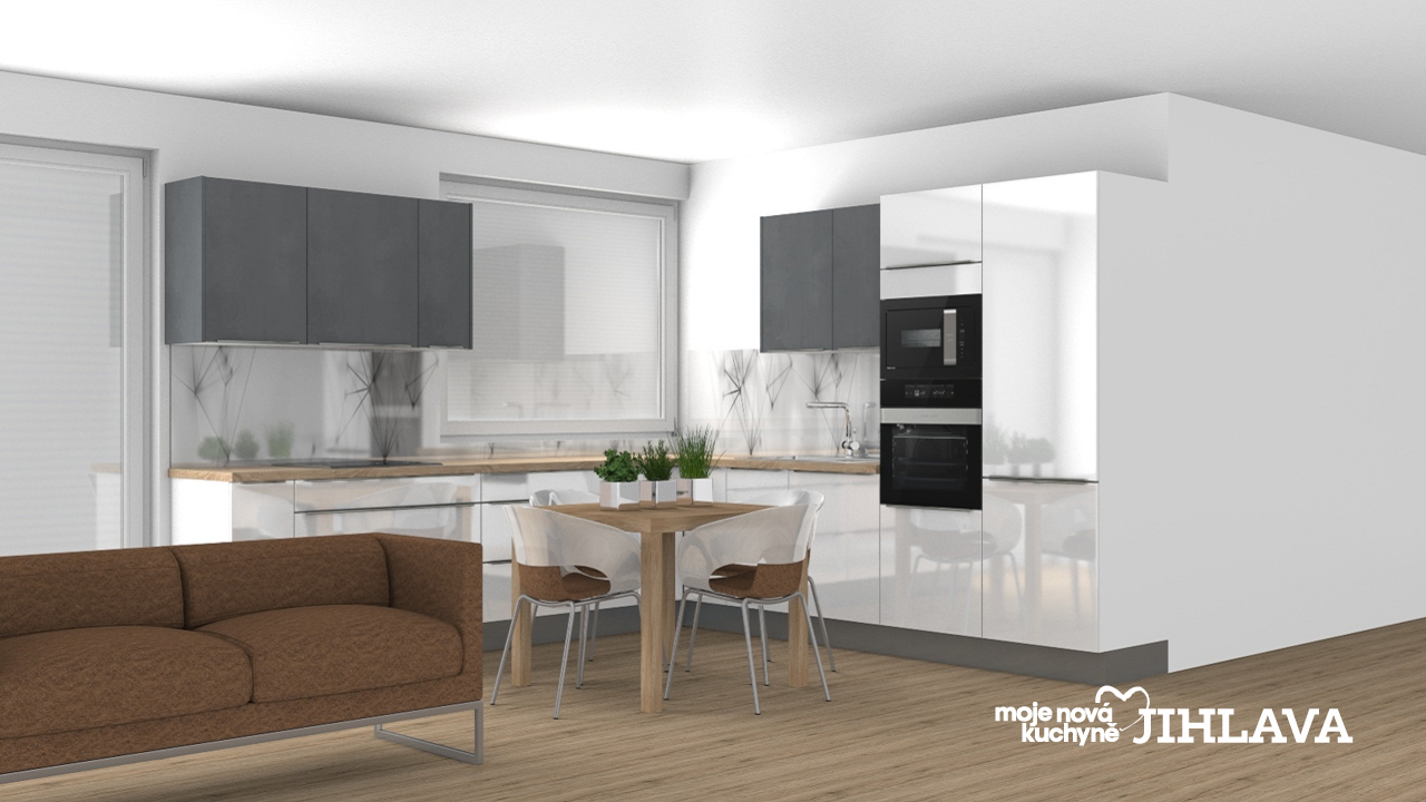 Moderní lakovaná kuchyně v bílo - antracitovém provedení, kombinace lesklého a matného materiálu. Luxusní nasazená úchytka Nella. Skleněný obkladový panel s nenápadnou grafikou. Horní skříňky v dominantním designu antracitového betonu se zajímavou strukturou.