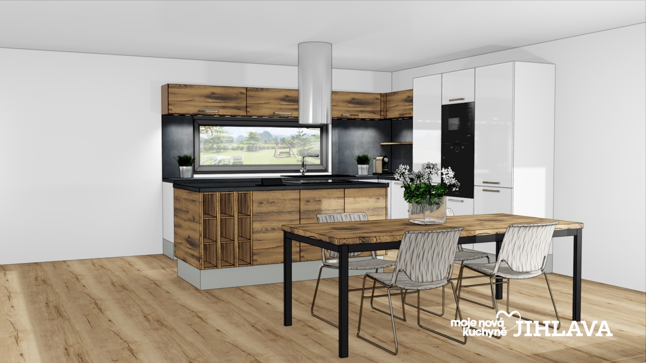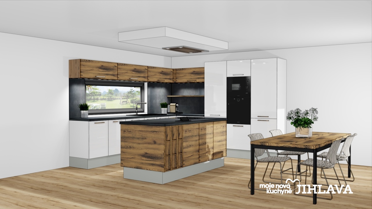 Ostrůvek je v dřevodekoru Montana, pro optické oddělení zadní části kuchyně a ostrůvku, který se opakuje i na horních skříní a polici.
