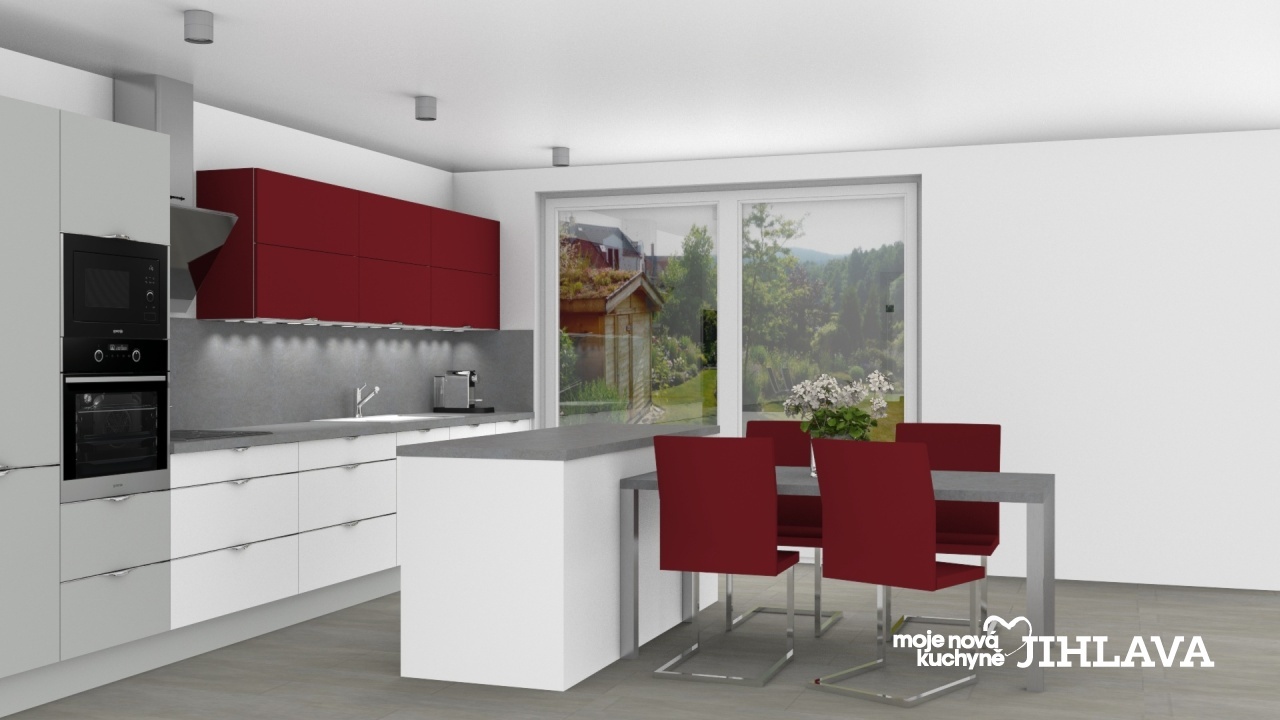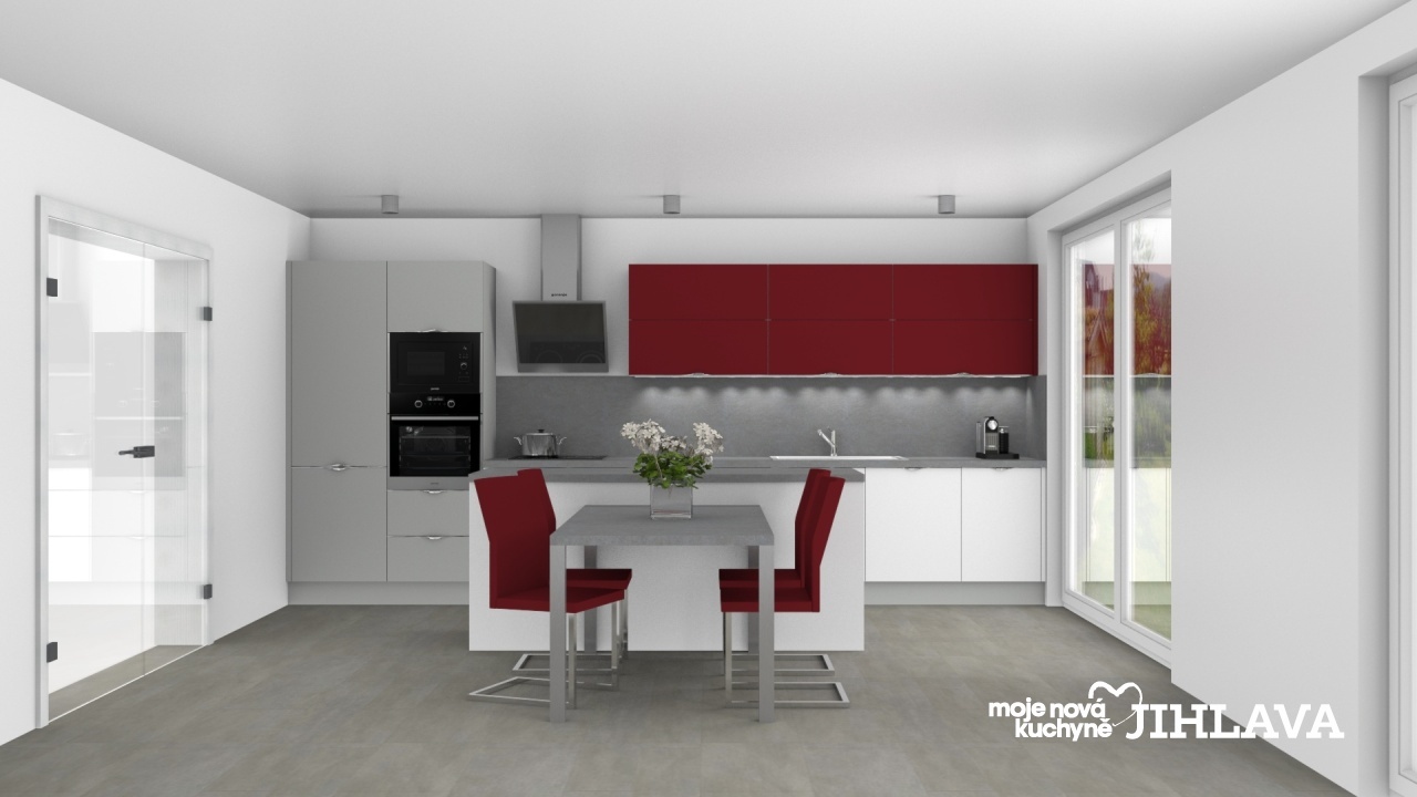 Moderní kuchyň Maxima a Isa v dekoru matné bílé na spodních skříňkách, matné šedé na bočních skříní a červené chilli na horních skříňkách.