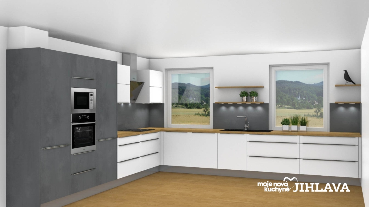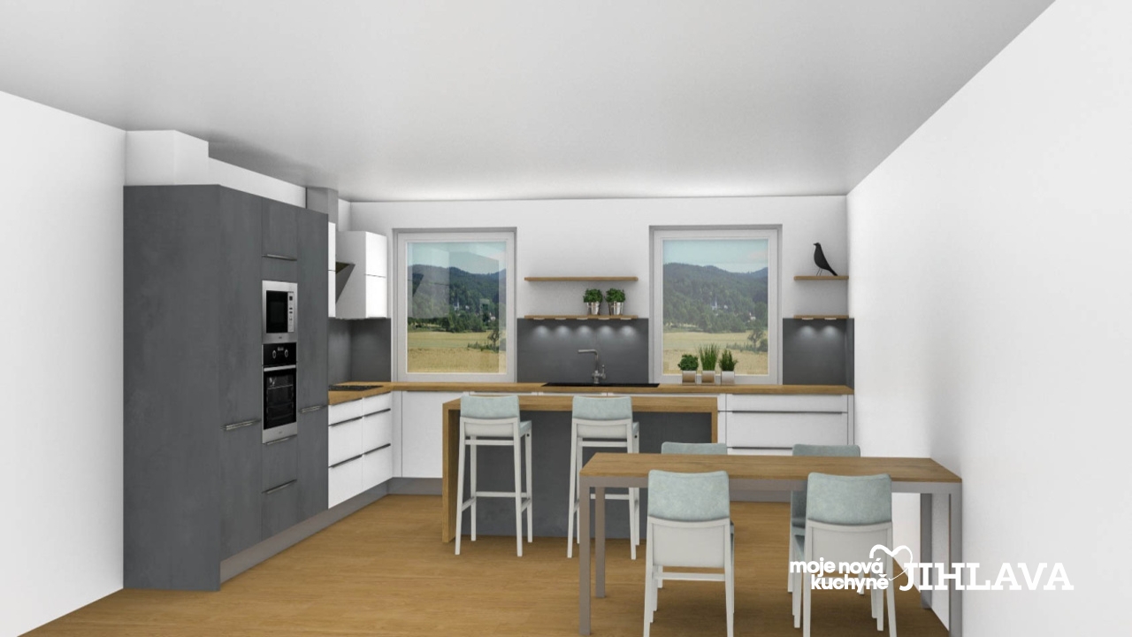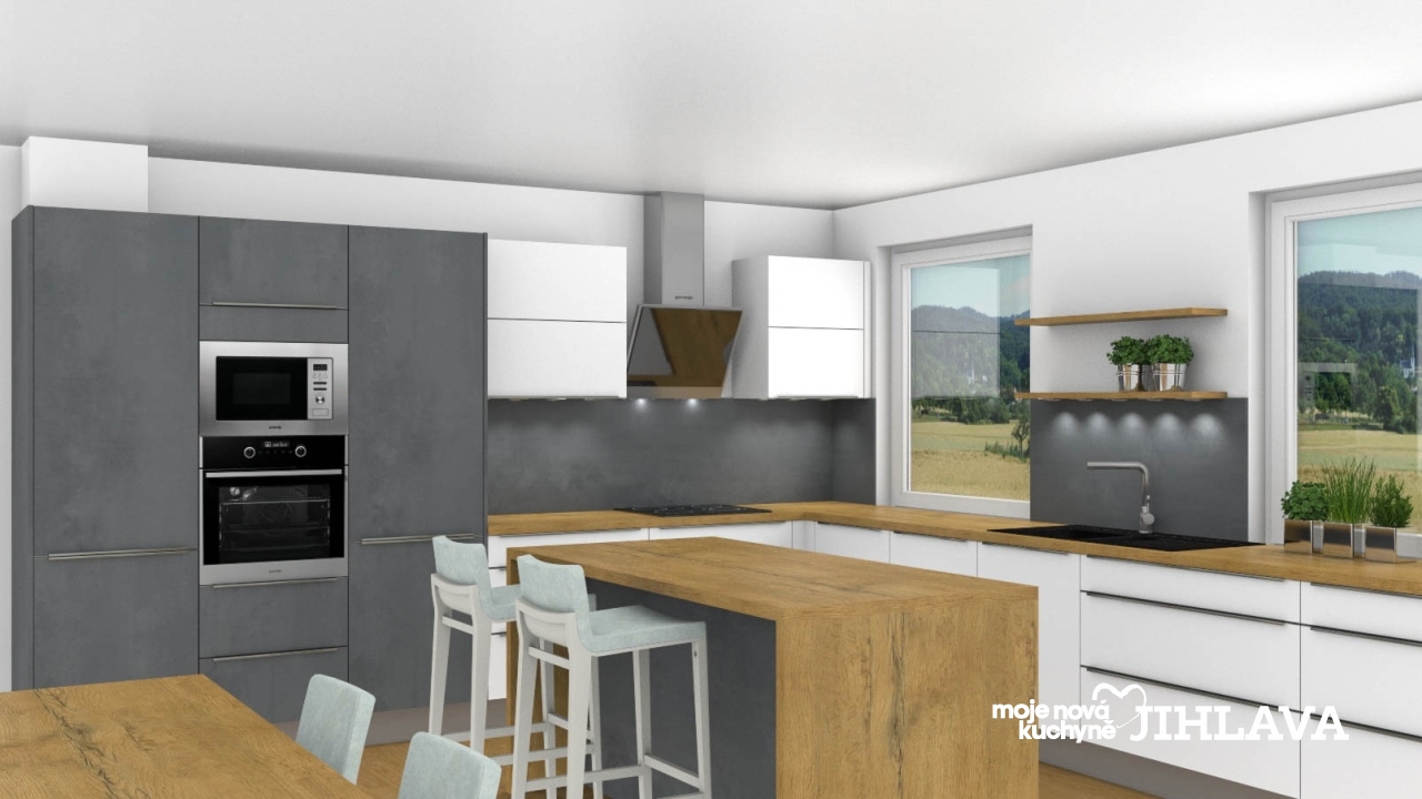 Kuchyně v barevné kombinaci beton antracit, bílá mat a dub divoký s nasazenou úchytkou. Kuchyně je převážně vyvedena v bílém matném laku. Vysoké skříně, záda ostrůvku a obkladový panel je v dekoru beton antracit. Pracovní deska a jídelní stůl je v provedené dub divoký.