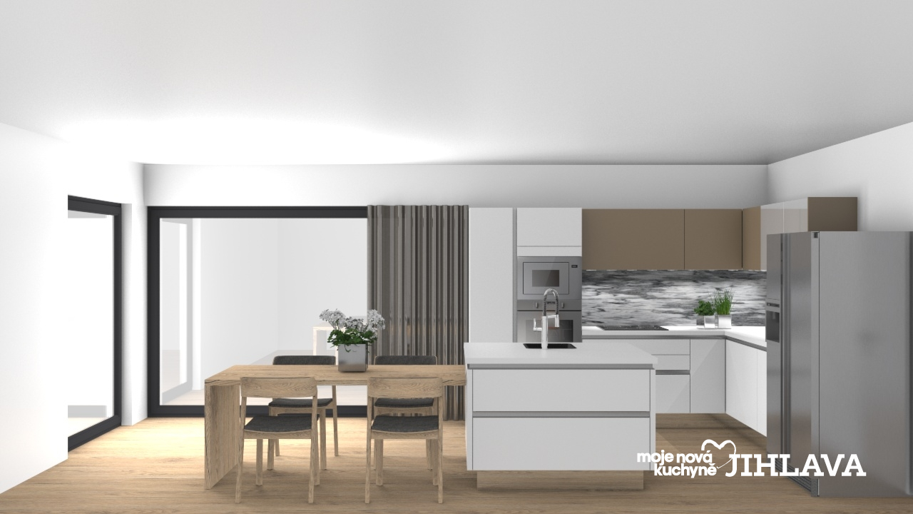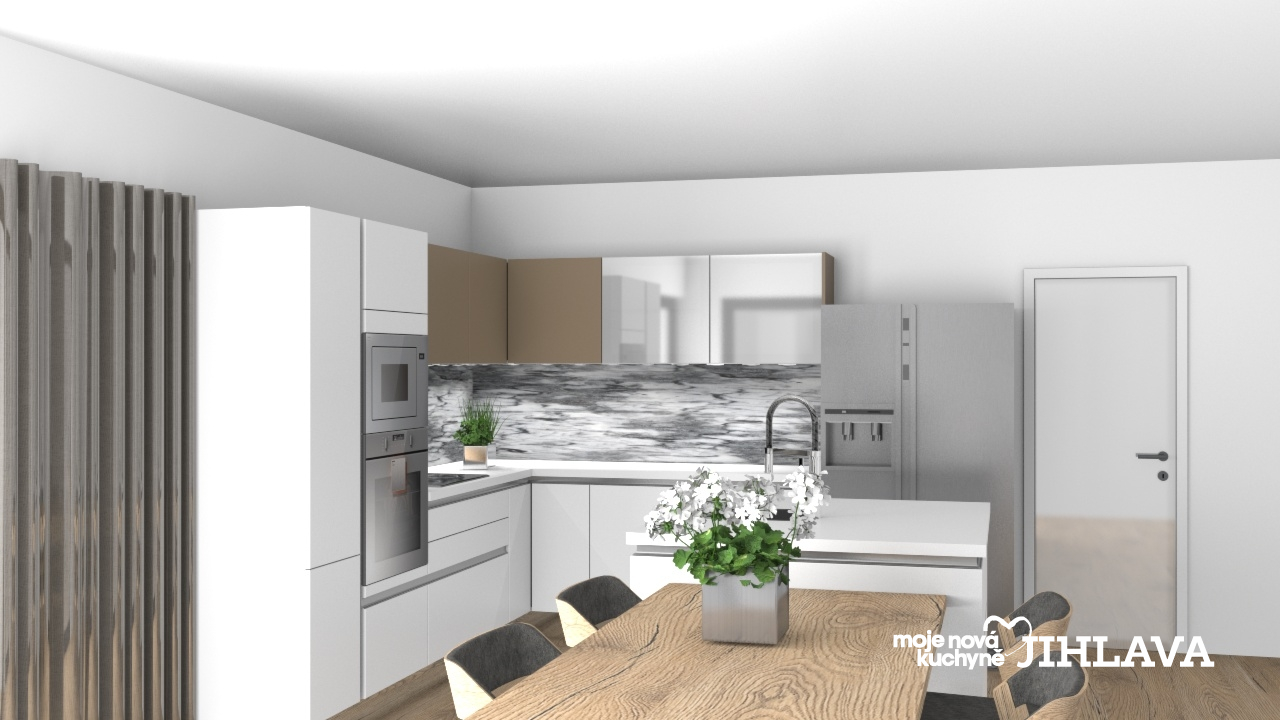 Dominantní prvek “Americká chladnička” s ledovačem značky Gorenje. Ostatní spotřebiče z  designové řady gorenje by Starck v zrcadlovém provedení. Vestavná myčka nádobí, vestavný set multifunkční a mikrovlnné trouby, indukční deska. Vestavný odsavač par nechává horní skříňky v jednolitém provedení.