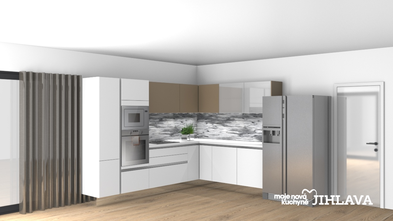 Barva v matném bílém laku koresponduje s bílou pracovní deskou, která vytváří dojem monolitu, zajímavou částí jsou pak horní skříně kde v hlavní roli boduje materiál Greta s lehký třpytem v měděném odstínu.