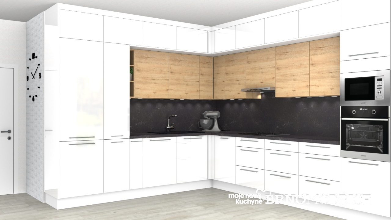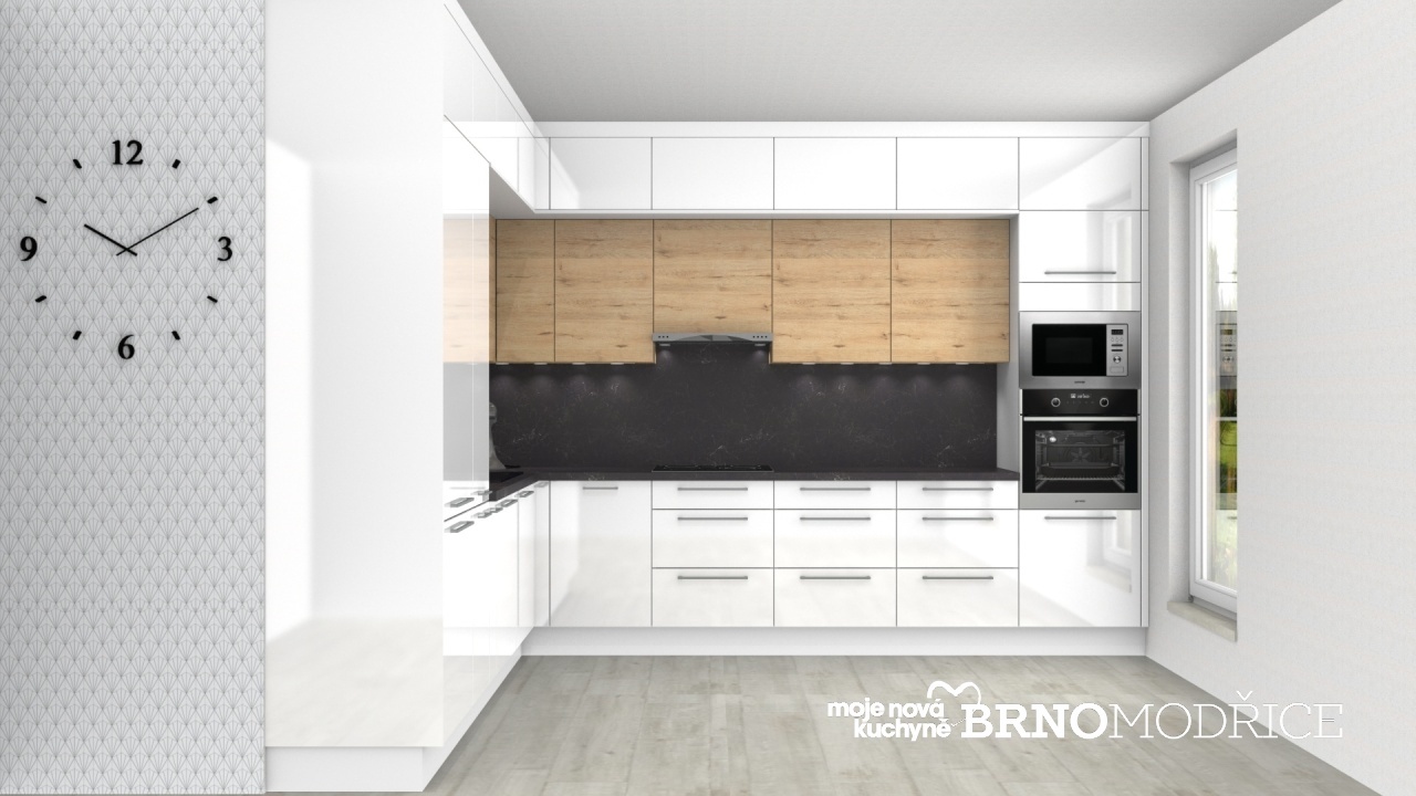 Kuchyňskou linku rámuje z jedné strany vysoká skříň pro vestavnou lednici a spížka s vnitřními výsuvy. Z druhé strany vysoká skříň pro troubu a mikrovlnnou troubu.