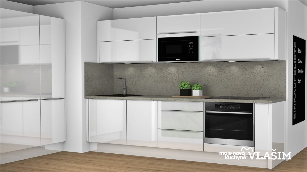 Susann v bílém lesklém laku v kombinaci s tmavě betonovou pracovní deskou.