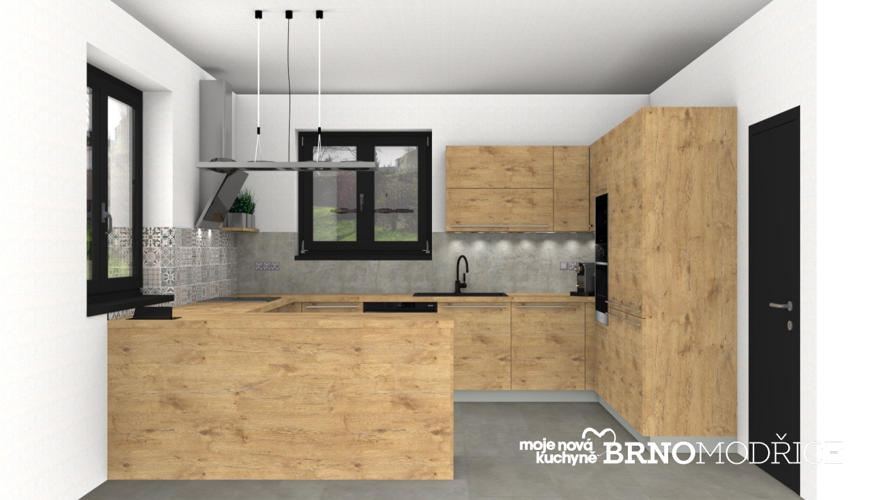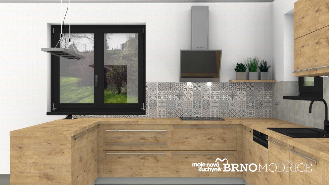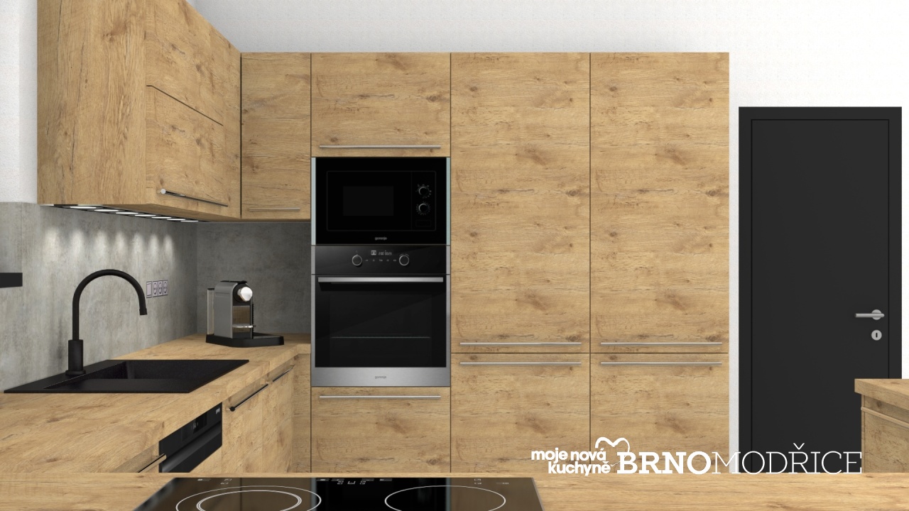 Vzhledem k umístění dvou oken v kuchyňském prostoru jsou horní skříně řešeny pouze vedle skříní vysokých, kde tak vznikl schovaný prostor pro umístění malých spotřebičů na pracovní desce.