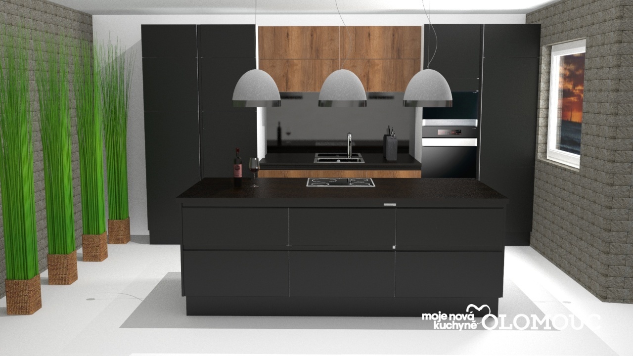 Krásná moderní černá matná v kombinaci s imitací dřeva nikdy neomrzí.