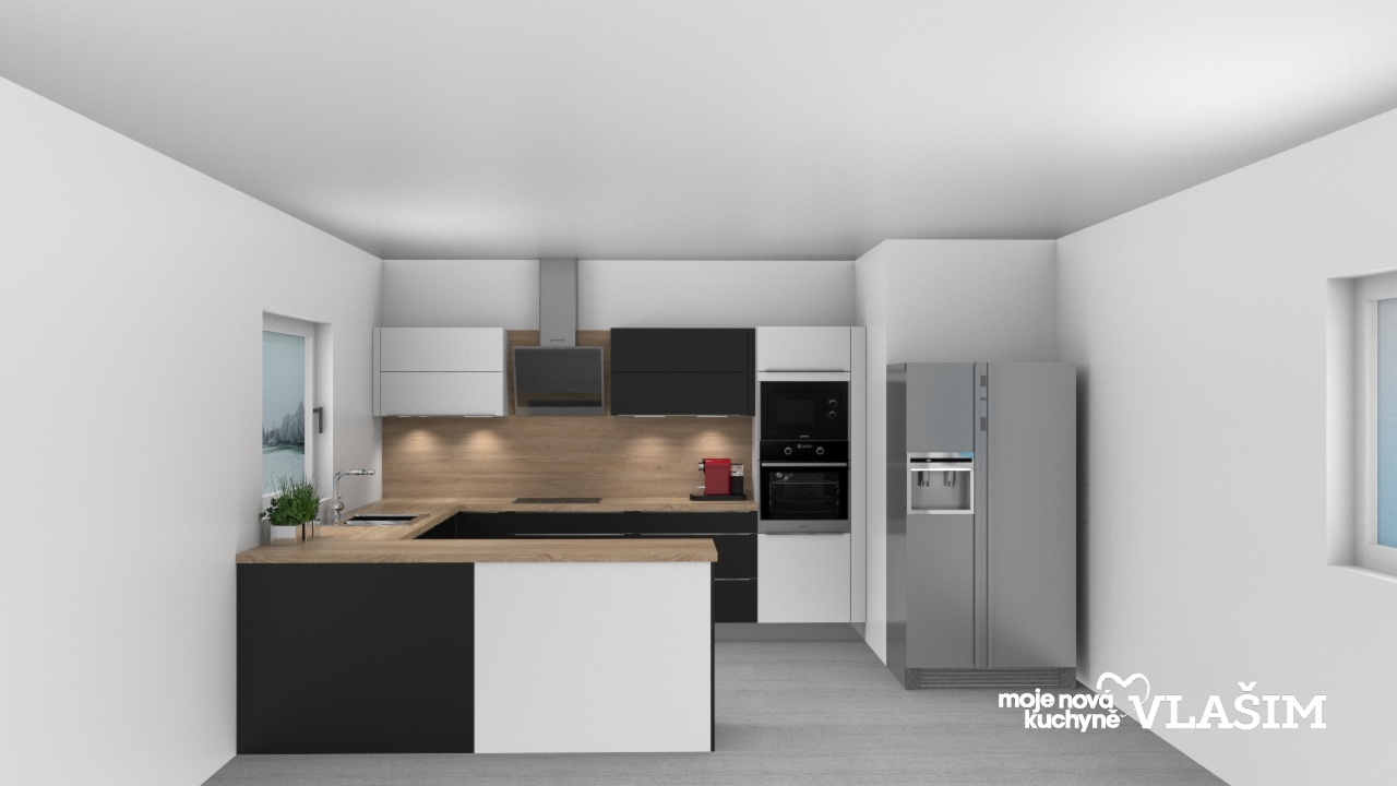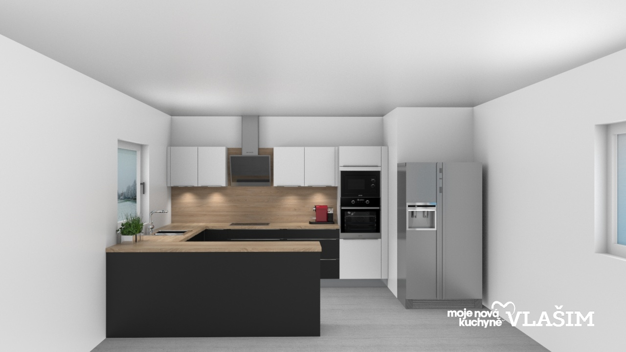 Kombinace černo – bílé matné kuchyně, modelu Ella s moderní designové řady gorenje. Úchytovou část elegantně řeší lesklá lišta. Pracovní deska  a zádový obkladový panel v designu dřevodekoru. Pracovní plochu do “U” ukončuje ostrůvek, který současně odděluje obývací prostor navazující na kuchyni.