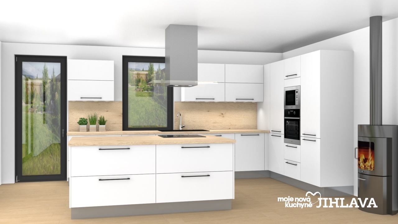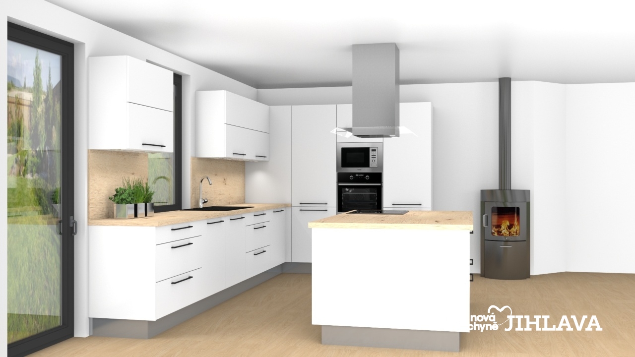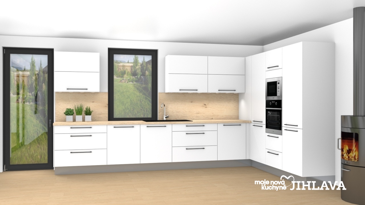 Moderní kuchyně do rozlehlého prostoru, s velkým množstvím úložného prostoru. Kuchyně je v provedení bílá hedvábně matná v kombinaci se světlým dřevem v dekoru dub pískový. S kontrastní délkovou úchytkou v černém provedení.