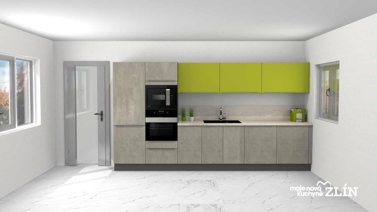 Jednoduchá rovná kuchyň v krásné světle šedé Celine v kombinaci s matnou limetkovou Ellou, která celou kuchyň oživuje.
