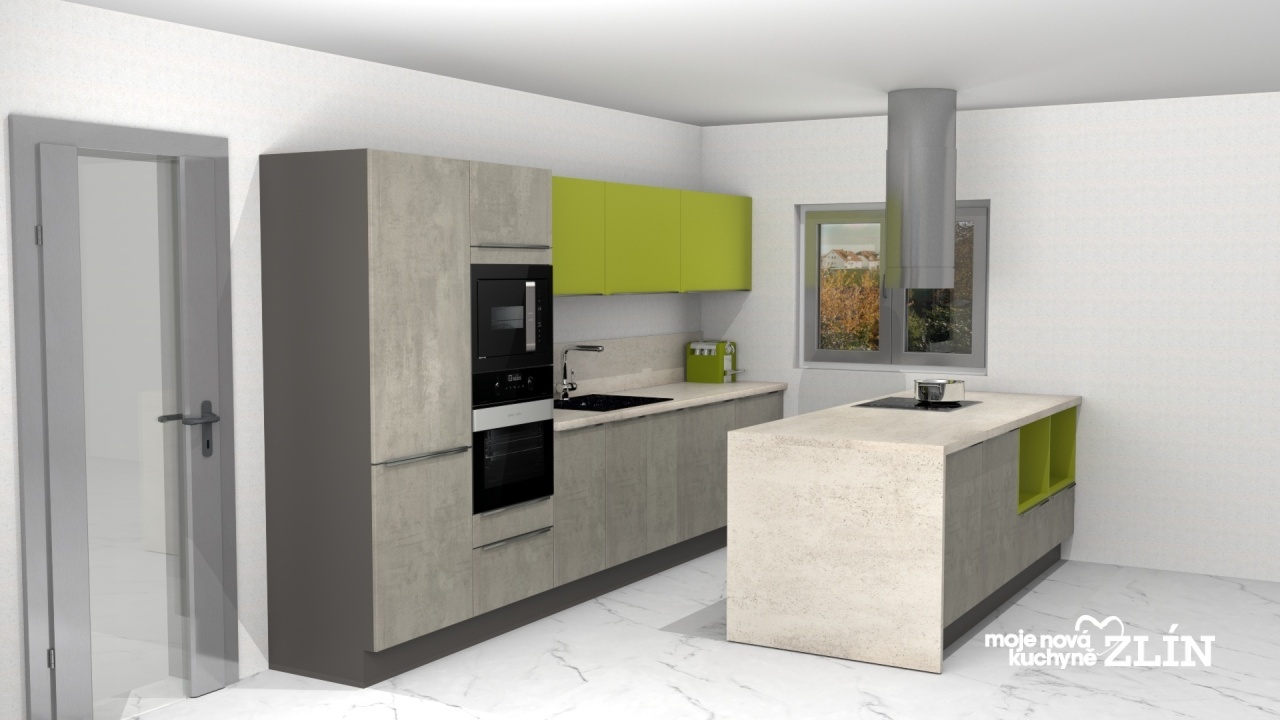Betonovou kuchyni jsme zde krásně oživili limetkově zelenou barvou na horních skříních a otevřených policích v ostrůvku.