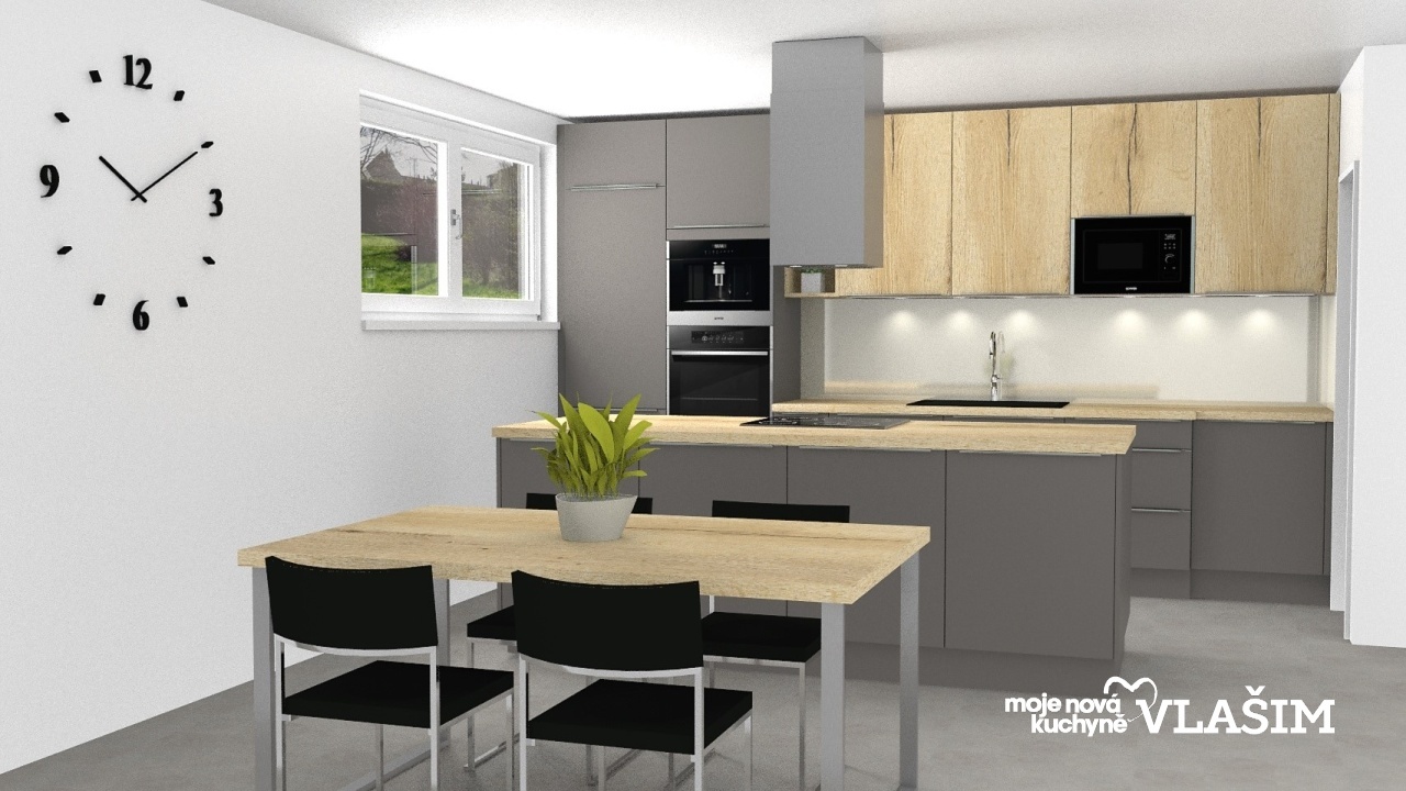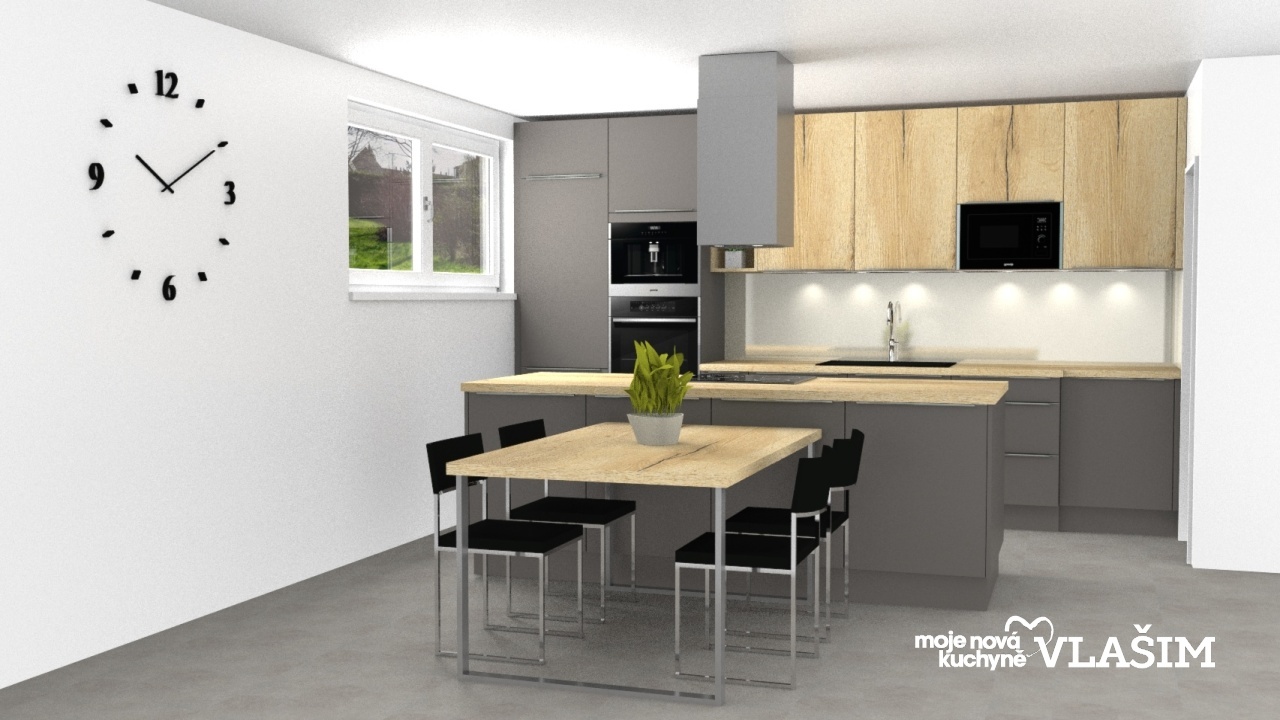 Krásná prostorná kuchyně v dekorech tmavě šedého antracitu, světlého dřeva – Dub Písek a krémové barvy.