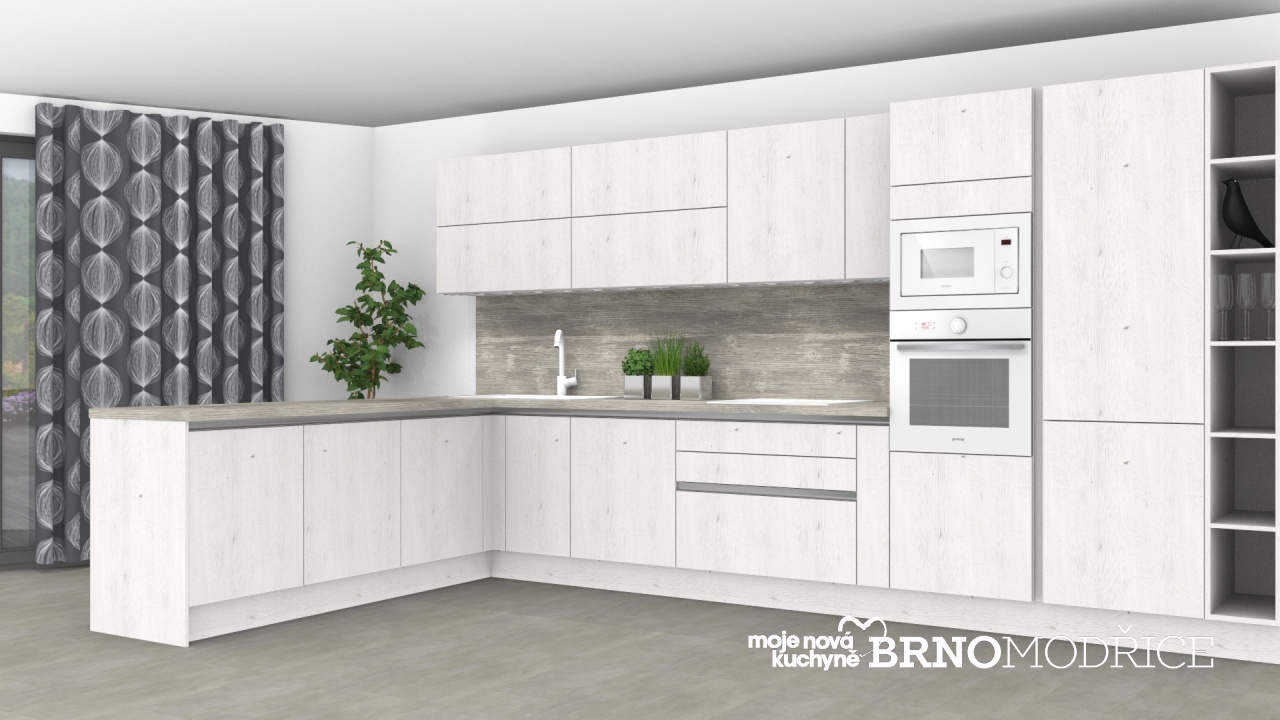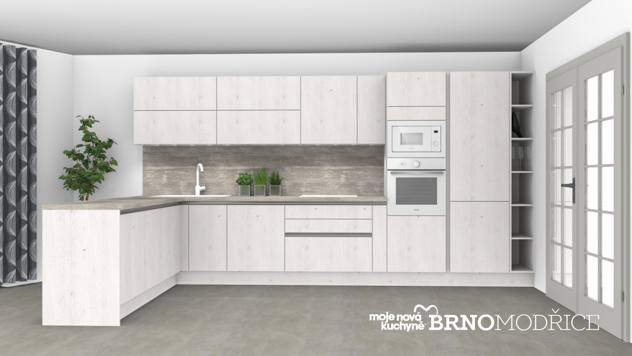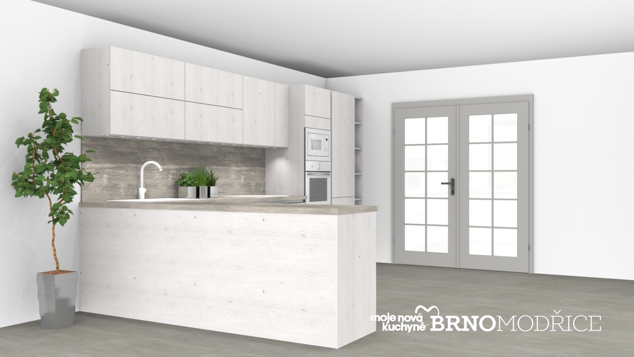 V tomto návrhu jsou použity dekory jako skandinávský (bělený) dub a tmavší výraznější dřevo v šedém odstínu.