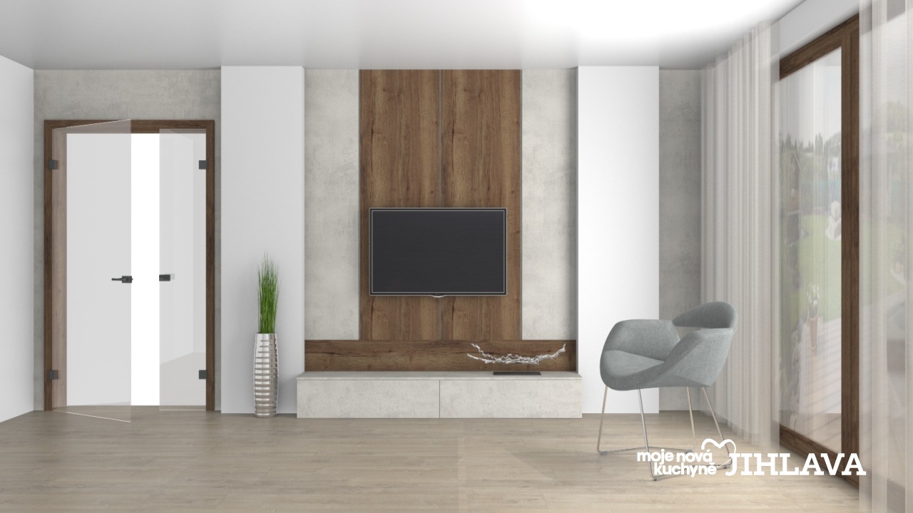 Moderní jednoduchá obývací stěna v kombinaci Cora Dub Terra a Celine Concrete White.