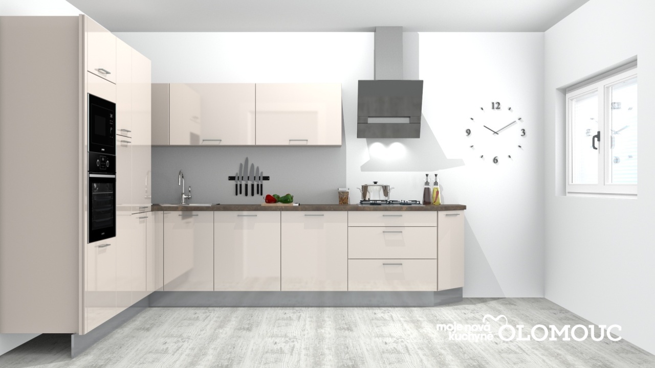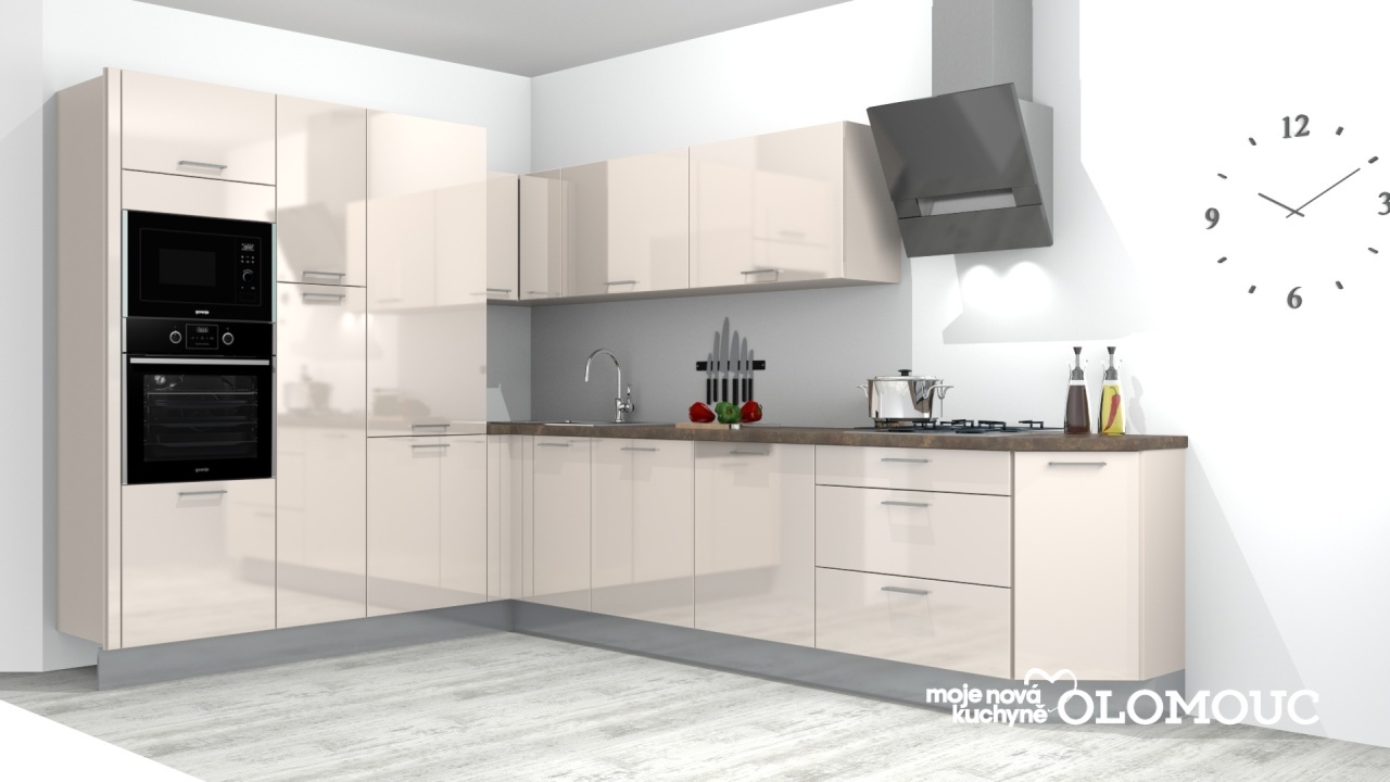 Jednoduchá lesklá Susann v pískově béžové barvě do tvaru L doplněna pracovní deskou v imitaci keramiky.