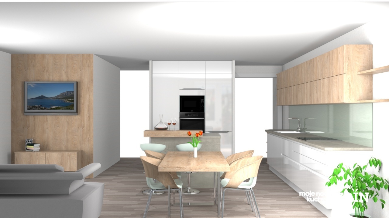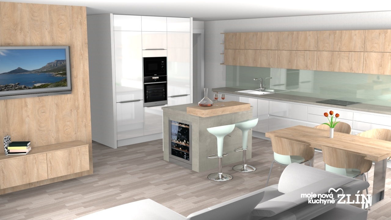 Přidány dvě skřínky pod televizi jako obývací stěna, které doplňují celý koncept kuchyně.