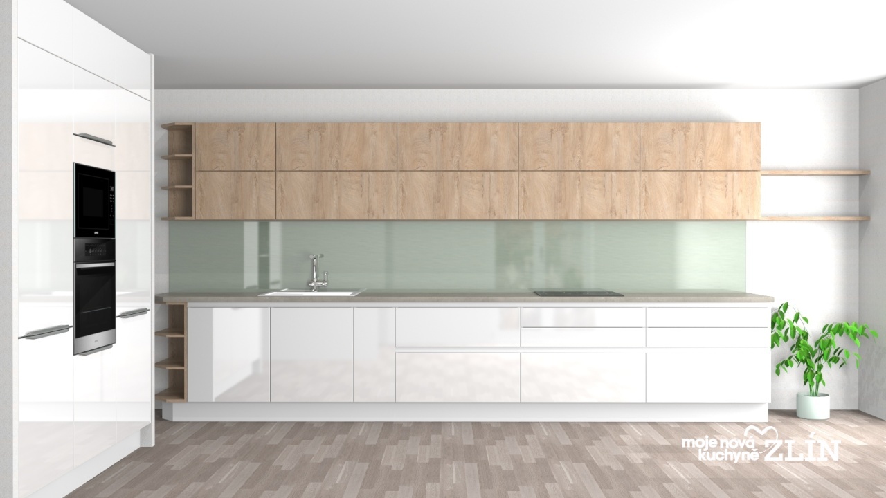 Moderní lakovaná kuchyně ve vysokém lesku dekor Sussan – bílá. Kombinace horních skříněk Cora – Grain Hell.