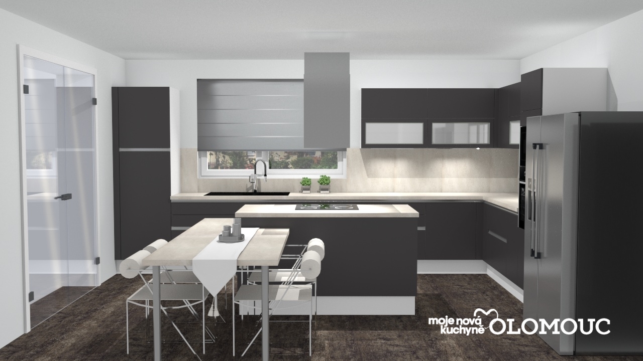 Klasická kuchyně Cindy Linea Piantra bezúchytková  v dekor dvířek Ebony, hedvábně matný s pracovní deskou v dekoru beton bílý, který je použit i jako zádový obklad. Jedná se o prostornou kuchyň s centrálním ostrůvkem. Součástí ostrůvku je i jídelní stůl, z něhož je protažena jídelní deska až ke konci ostrůvku. V této přesáhlé části vznikl pod deskou úložný prostor, který je 80cm široký – výsuv. O pracovní prostor zde rozhodně není nouze, kuchyně se pyšní takřka 5,5 m volné pracovní plochy, a i horní skříně nabízí více než dost úložného prostoru. Horní skříňky jsou lomené, výklopné. V kuchyni jsou tři vysoké skříně: přístrojová, pro troubu a mikrovlnou troubu, potravinová skříň s výsuvy a ve třetí je vestavná lednice. Je zde užito také mnoho výsuvů a zásuvek, které umožňují dobrou a přehlednou manipulaci s uloženými komponenty. Spodní roh je řešen ledvinkovým výsuvným systémem.