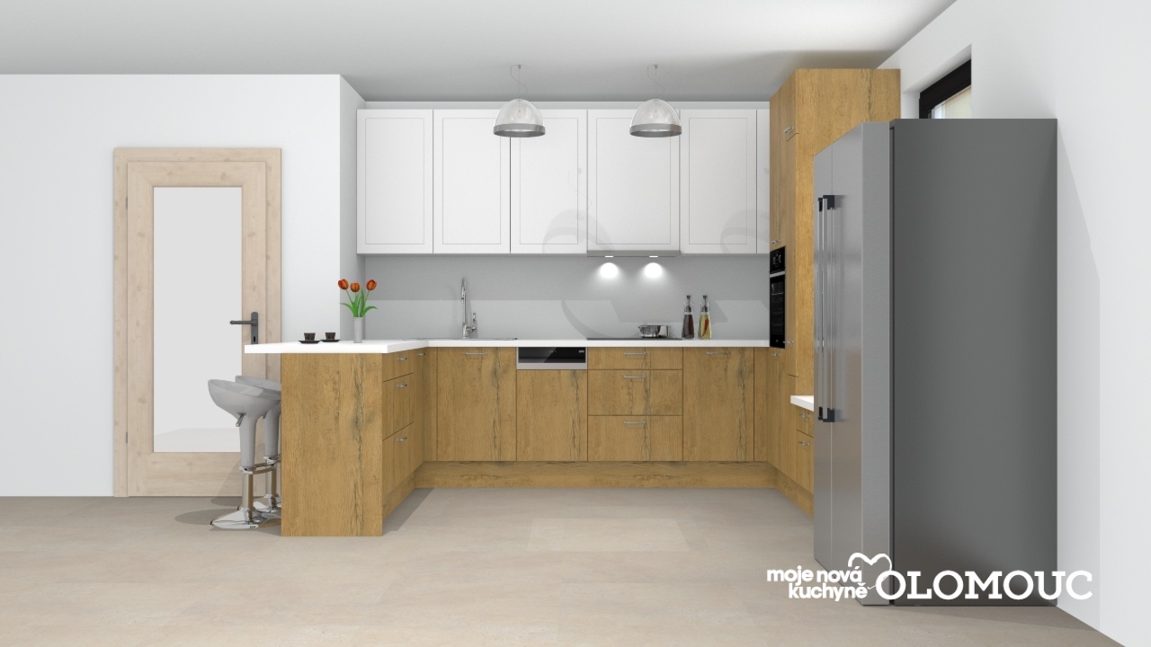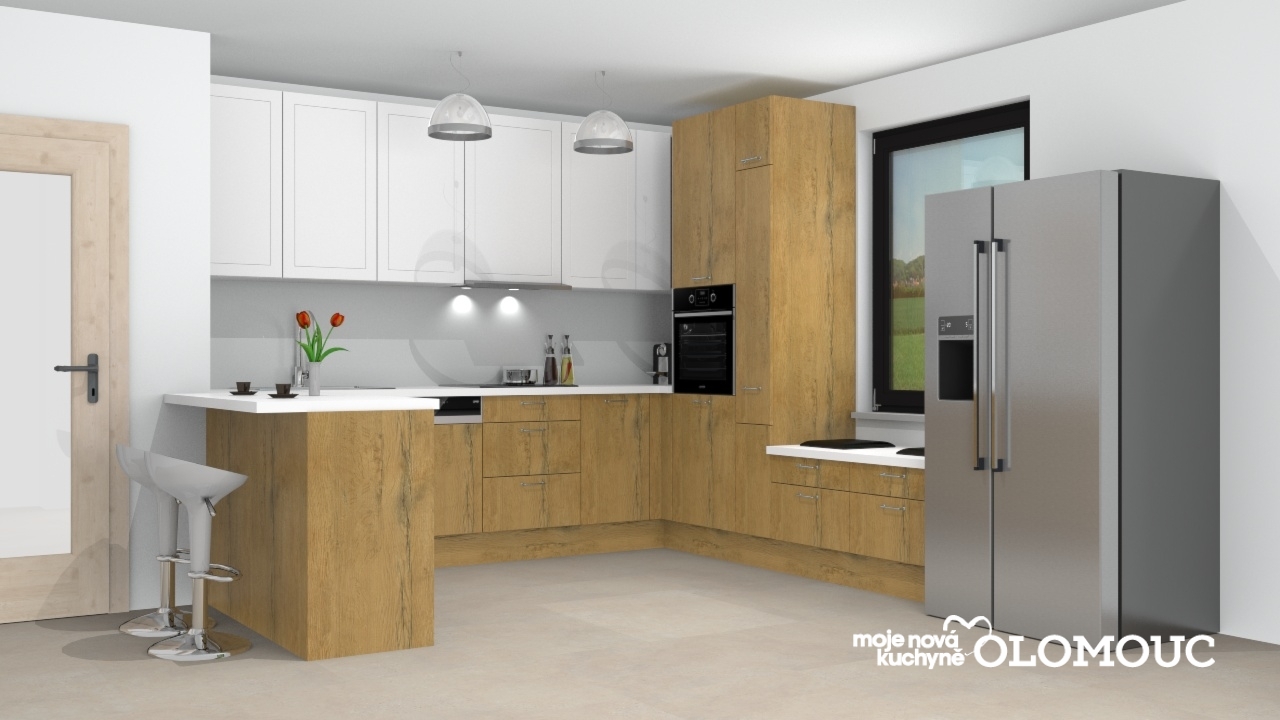 Jednoduchá klasická kuchyně v rustikálním stylu s decentním prolisem na horních skříních. Kombinace bílé barvy na horních skříňkách bez úchytek a dubu divokého na spodních skřínkách s černou antickou úchytkou, působící nadčasově. Pracovní deska v bílá sametově matná v laminátu. Výsuvný odsavač zabudovaný ve skřínce, slouží k nenarušení linie horních skříní a k udržení čistého designu. Potravinová skříň vybavená drátěnými koši v šířce 30 cm a přístrojová skříň s troubou, je ideálním řešením úložných prostor. Rohové úložné prostory jsou řešeny policovými skříňkami. Sestavu kuchyně doplňují skříňky u dřezu s výsuvem 120 cm široké a pod varnou deskou 60 cm široké. Prostor pod oknem s nízkými zásuvkami je v tomhle návrhu využit jako prostor na sezení. Celou sestavu zakončuje bar s předsazenou pracovní deskou pro pohodlné sezení.