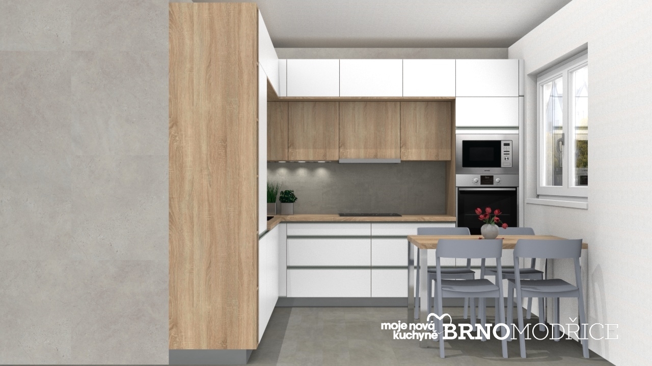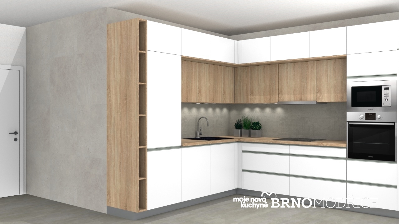 Bílá matná lakovaná kuchyně Ella s dřevodekorem Dub Sonoma kuchyně Cora.