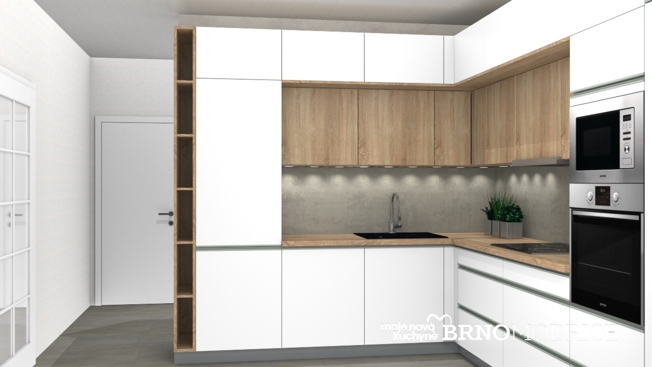 Korpusy skříní, pracovní deska a opláštění výklenku pod nástavnými skříněmi je ve stejném dekoru jako horní skříně a tvoří tak efektní lemování výklenku.