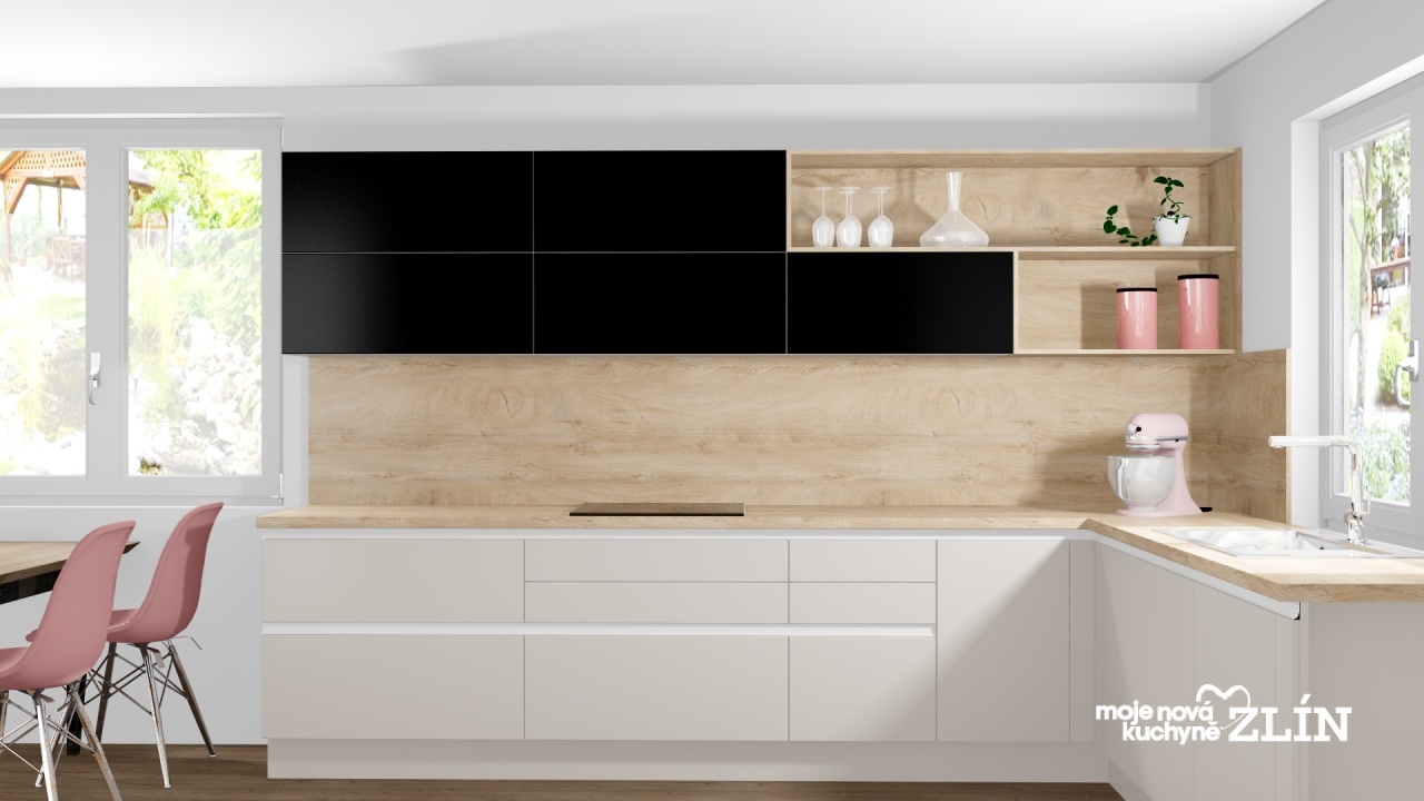 Moderní Ella v lakovaných sametově matných dvířkách v pískové a černé s kombinací dřevodekoru na pracovní desce, zádovém obkladu a otevřených policích v dřevěném dekoru Cora – Obilí světlé.