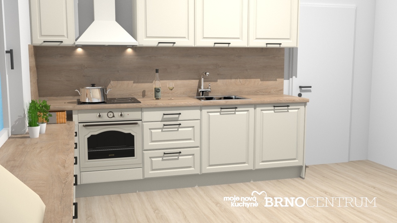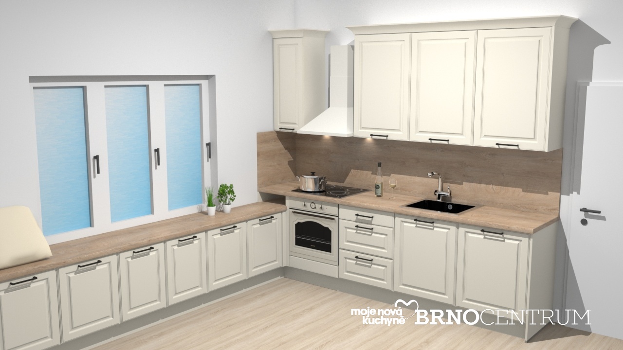 Rustikální krémová Nadine s profilovanými dvířky v kombinaci s pískovým dubem na pracovní a zádové desce.