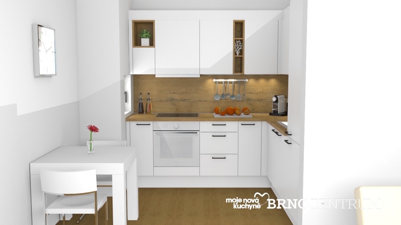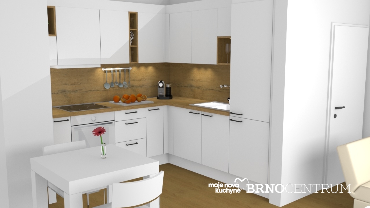 Osvědčená kombinace modelu Cindy v dekoru bílá hedvábný mat a modelu Cora v dekoru divokého dubu. Dekor divokého dubu byl využit na horních otevřených skříních s policemi, pracovní desku i zádový obklad.