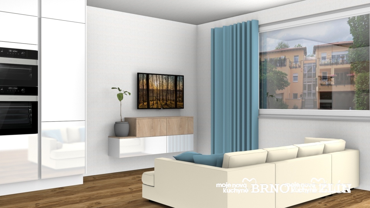 Dispoziční řešení do tvaru L a součástí návrhu je i jednoduchá obývací stěna.