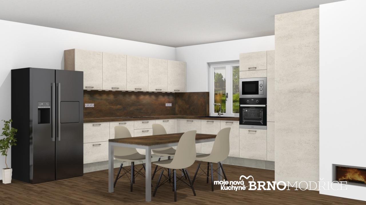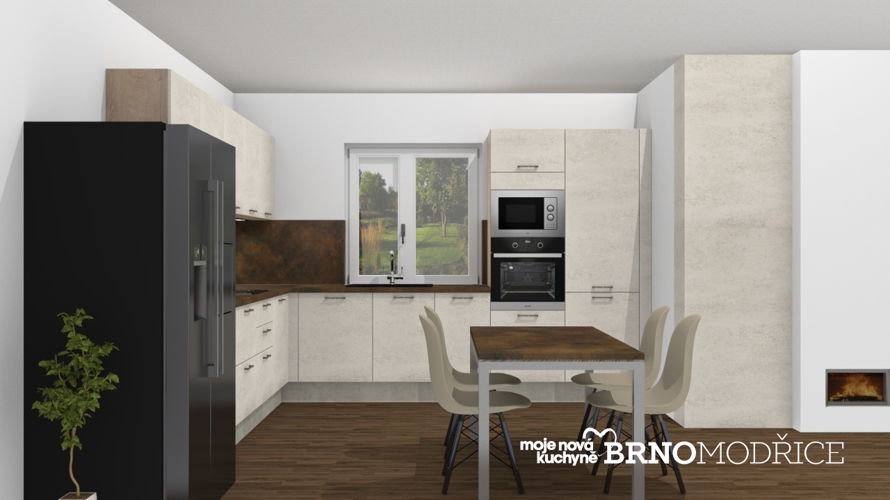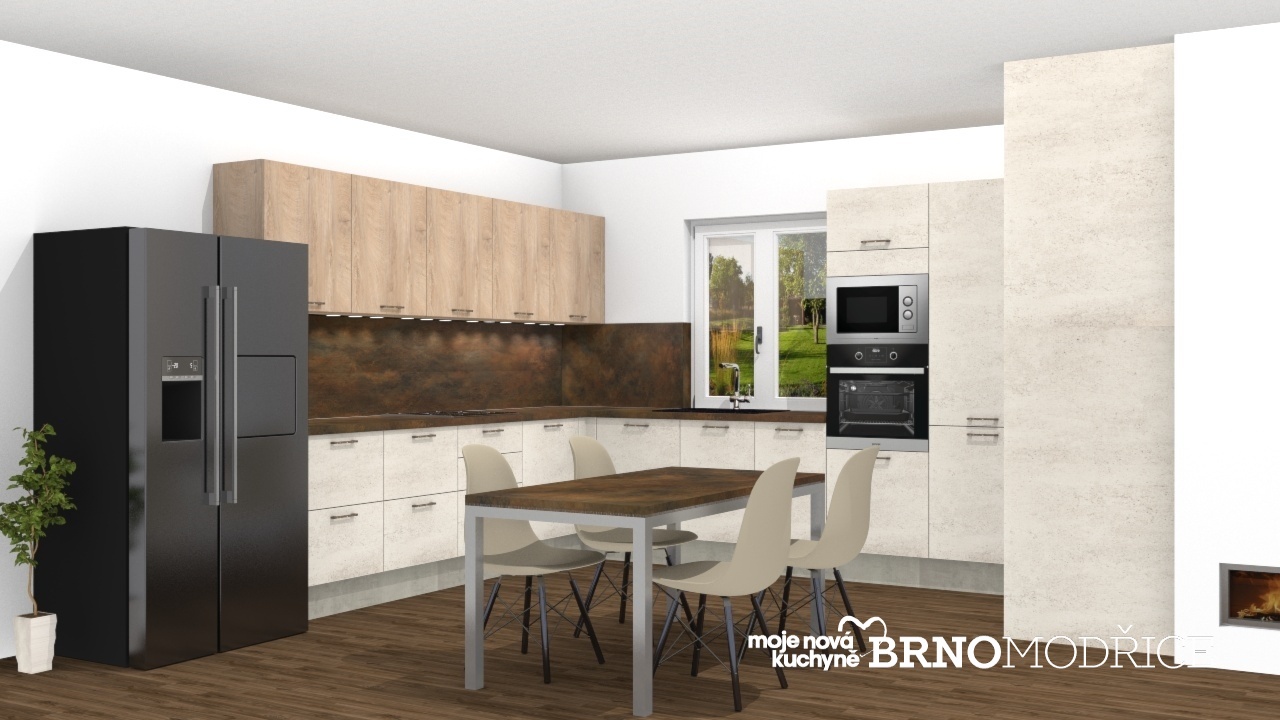 Navržena i druhá varianta, kde jsou horní skříňky ve světlém dřevodekoru.
