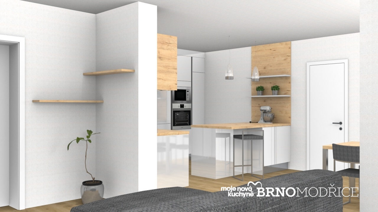 Poslední částí kuchyně je oboustranný ostrůvek přisazený ke stěně. Toto přisazení umocňuje zádový obklad v dřevodekoru oživený policemi v dekoru kuchyňských dvířek.