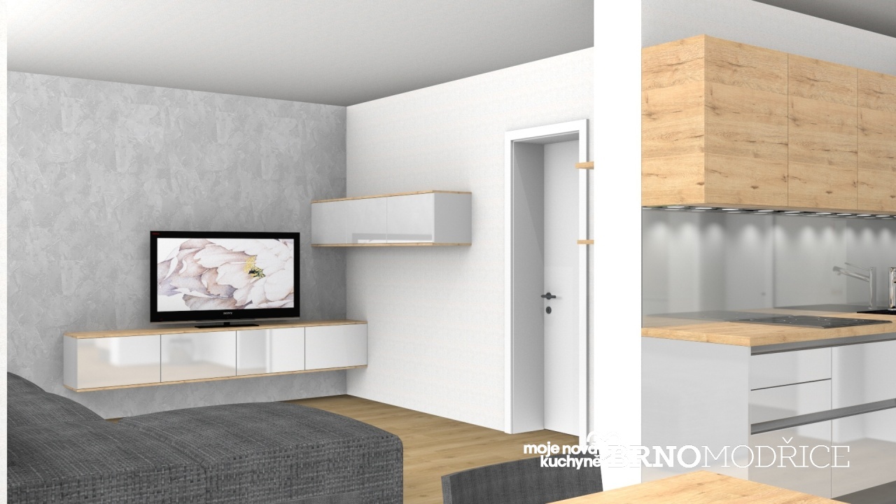 Ve stejném dekoru jako je kuchyně je řešen i jídelní stůl a obývací stěna.