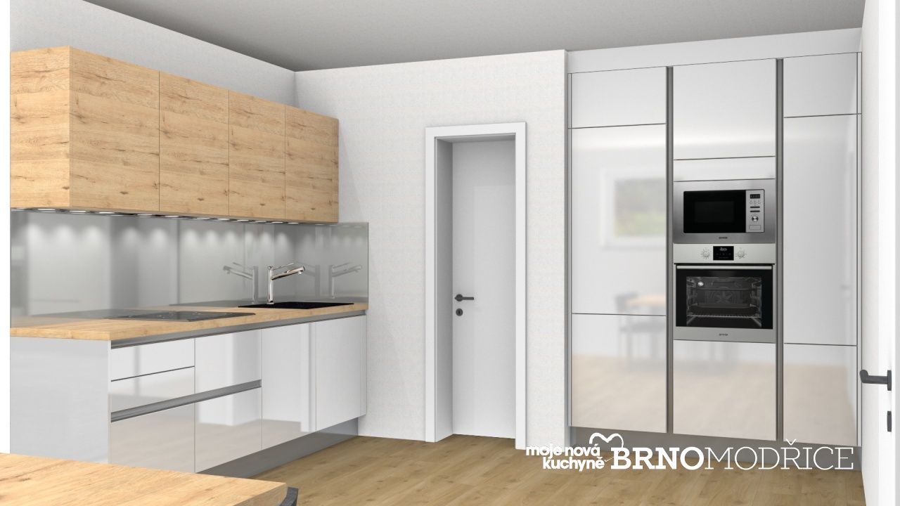 Výklenek místnosti je uzpůsoben pro vysoké skříně, konkrétně pro skříň na vestavnou lednici, skříň pro horkovzdušnou troubu a vestavnou mikrovlnnou troubu, a spížní policovou skříň.