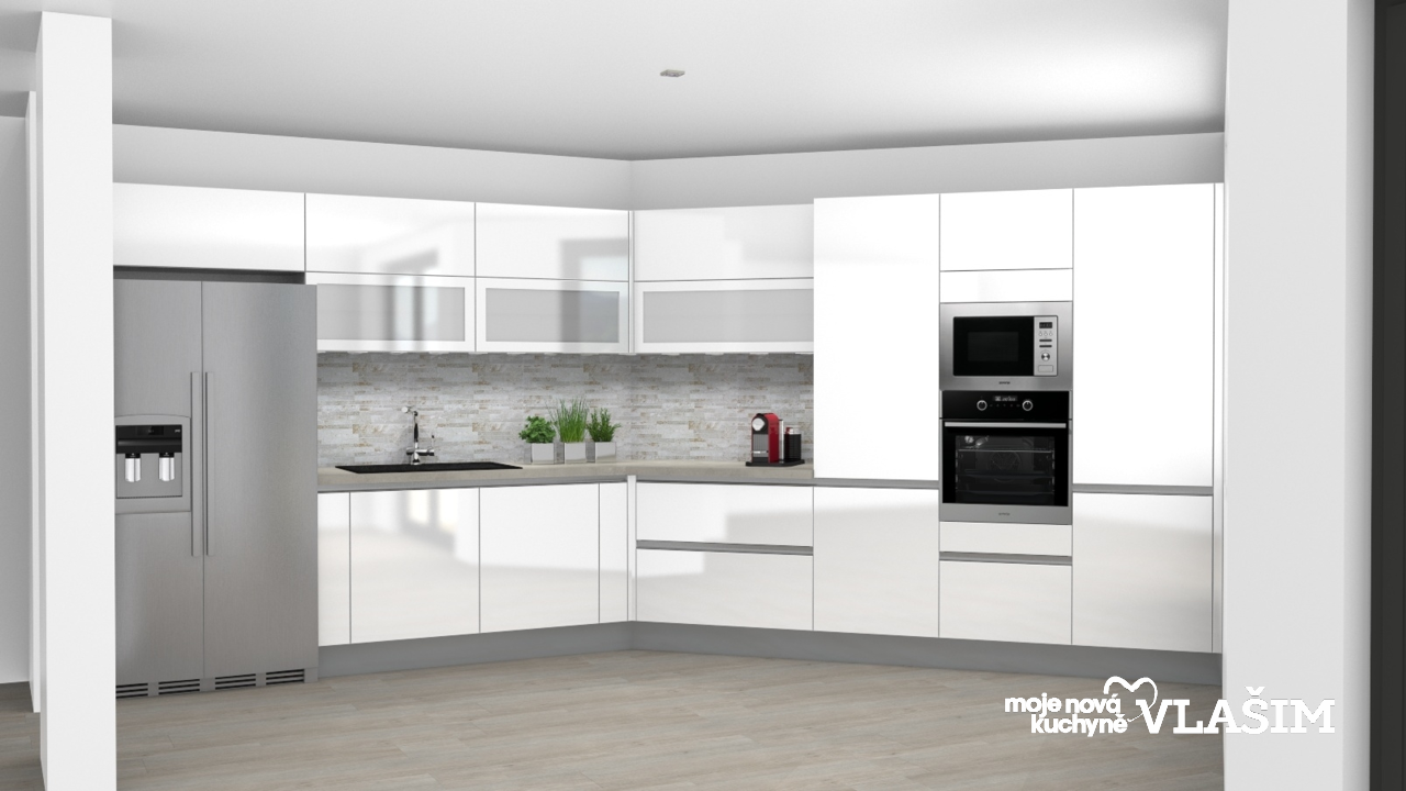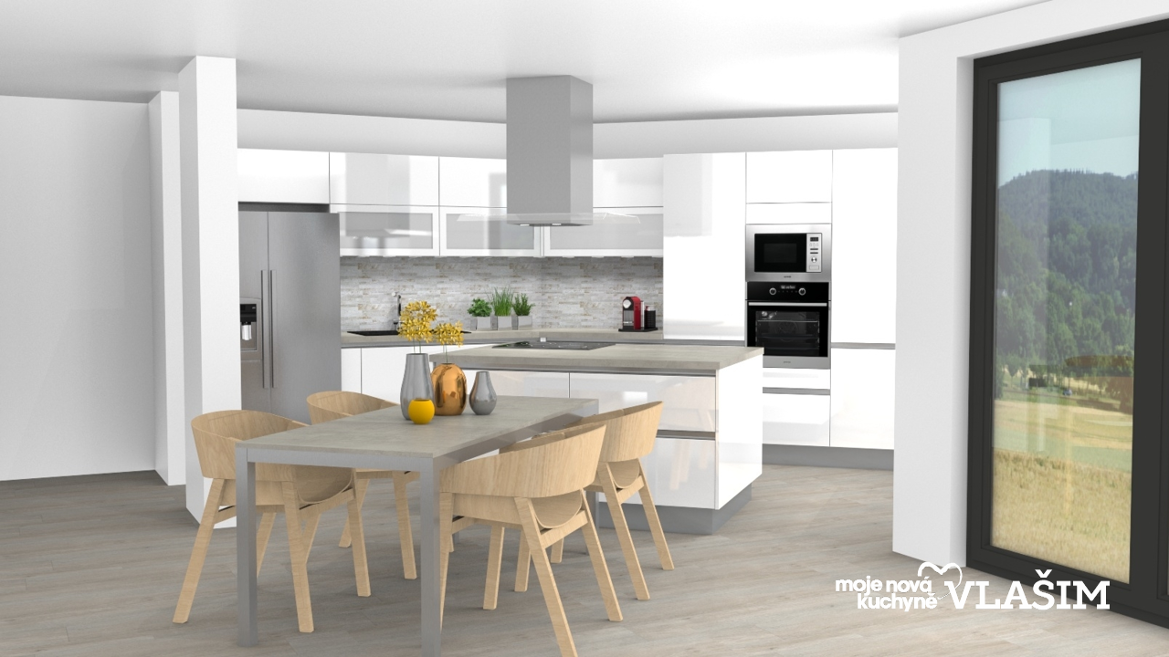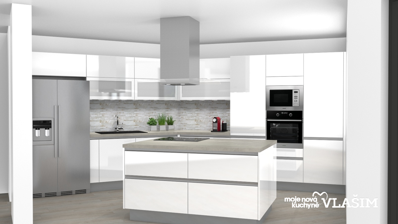 Moderní designová kuchyně v prostorově rozsáhlé dispozici s netradičním úhlem 135° . Bílá v bezúchytkovém provedení Linea Piantra ve vysokém lesku. Velký ostrůvek s varnou plochou a ostrůvkovou hranatou digestoří. V návrhu je opravdu hodně úložného prostoru. Ke kuchyni  v návrhu nasimulovat a poté i vyrobit stůl, přesně na míru potřebám zákazníka a prostoru.
