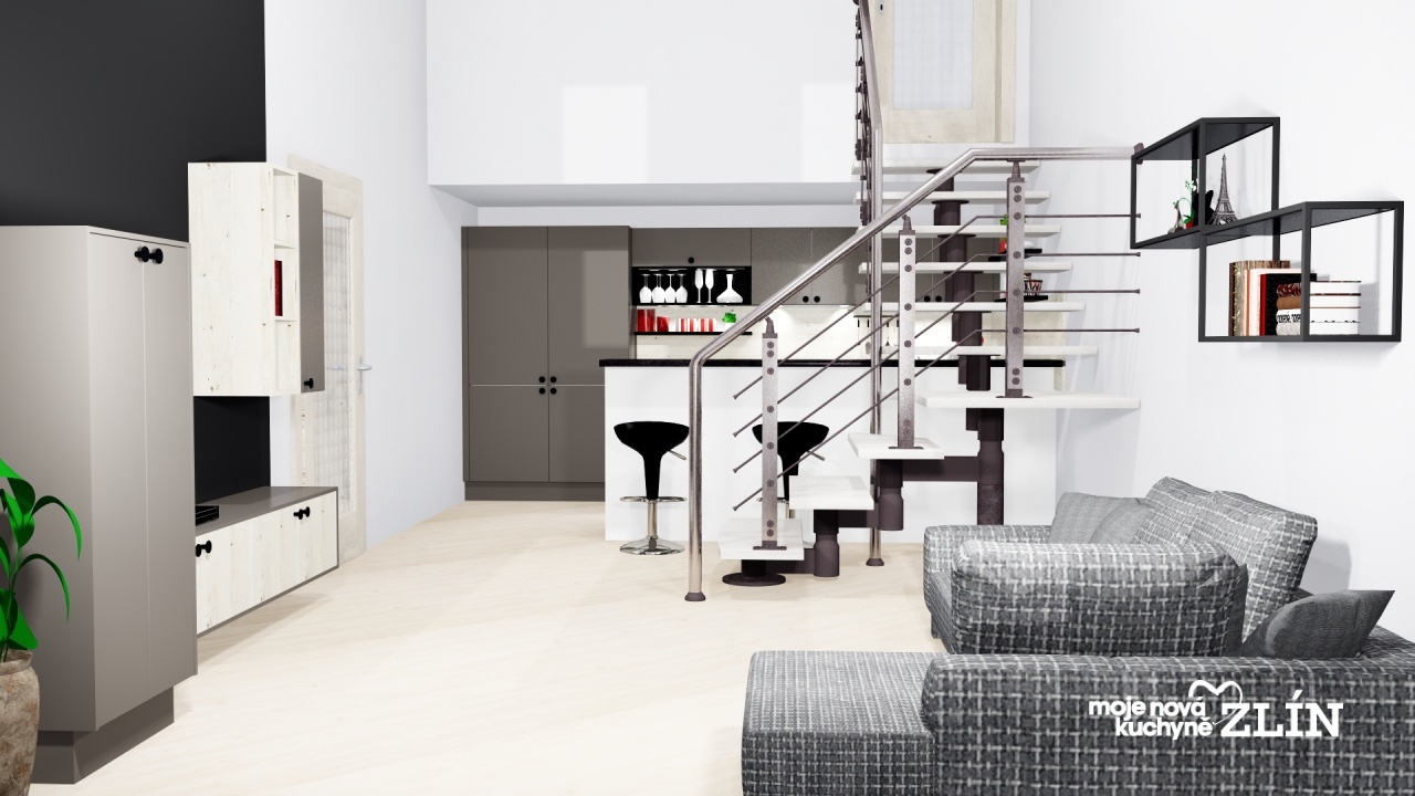 CindyKuchyně s obývací stěnou do loftového bytu v šedých odstínech