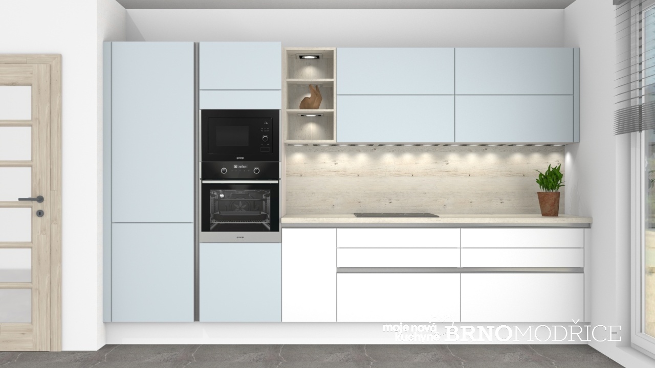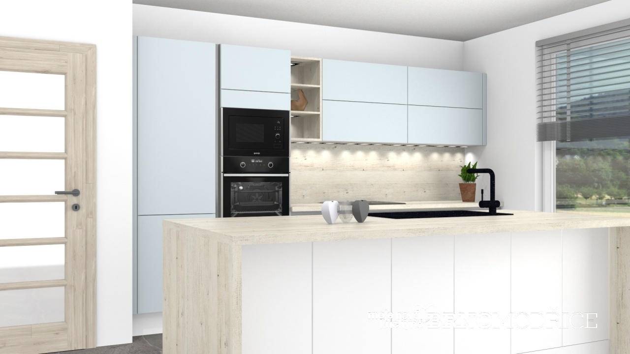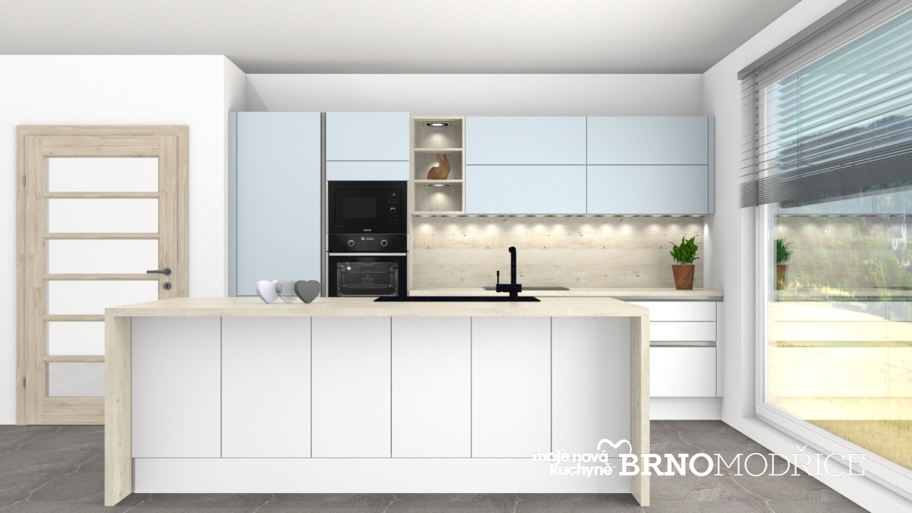 Krásná světlá kuchyně oživená pastelově modrou barvou ve velice jemném odstínu, který se jen tak neokouká.