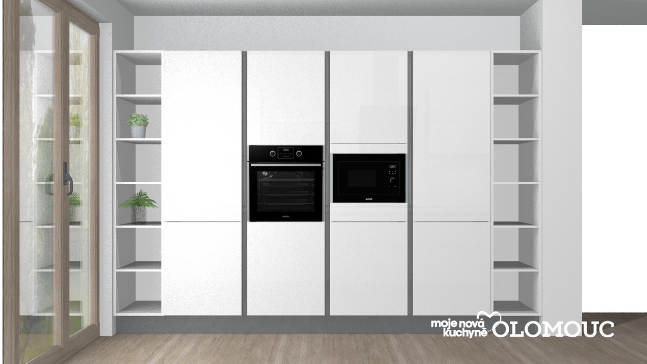 Ve vysokých skříních na protilehlé straně je vestavná chladnička s mrazničkou, potravinová skříň s výsuvy a přístrojové skříně na troubu a mikrovlnou troubu s dalším úložným prostorem.