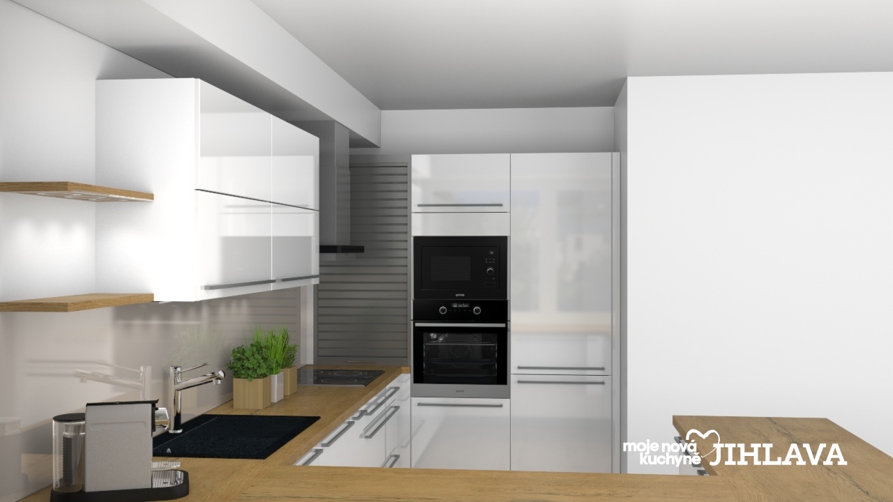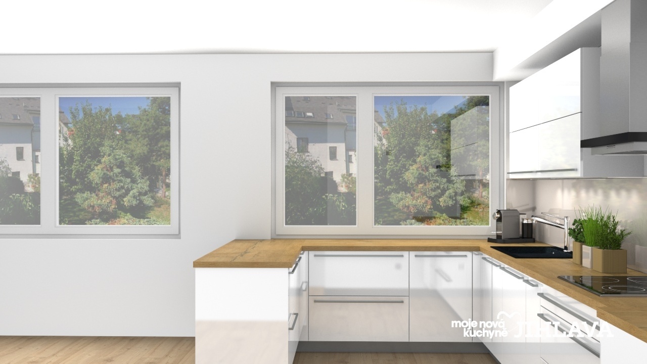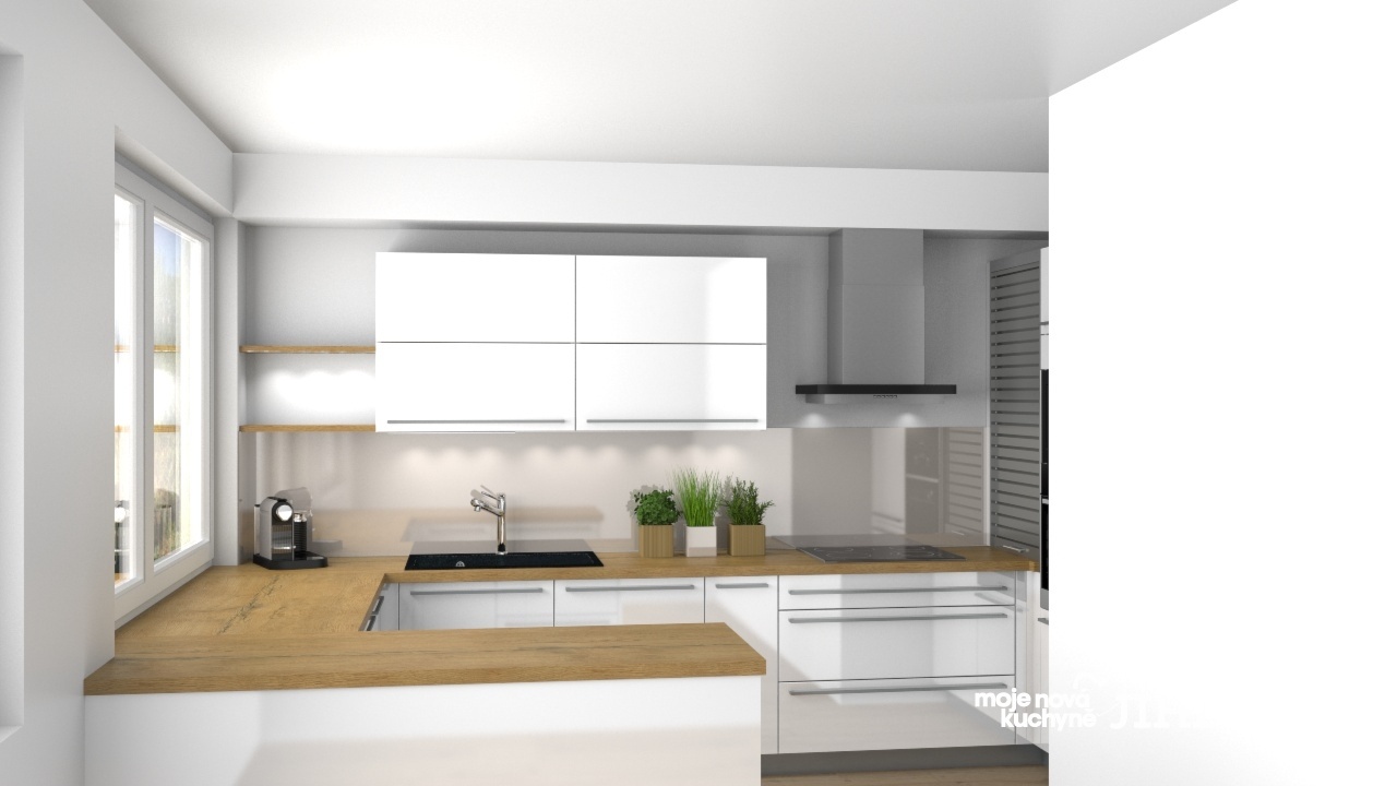 Moderní kuchyně v bílém lesklém provedení s tmavší dřevěnou pracovní deskou dub divoký. Jsou použité nerezové matné úchytky, které dodají výraznější vzhled kuchyně. Pracovní deska je protažená do okna místo parapetu. Za kuchyňskou linkou je plánované kalené sklo v béžovém odstínu. Za rohem jsou umístěné vysoké skříně, které nijak neruší celkový dojem kuchyně. Horní výklopné skříňky umožňují pohodlný otevírání. U okna jsou umístěné police v dekoru dřeva, které prostor odlehčí.