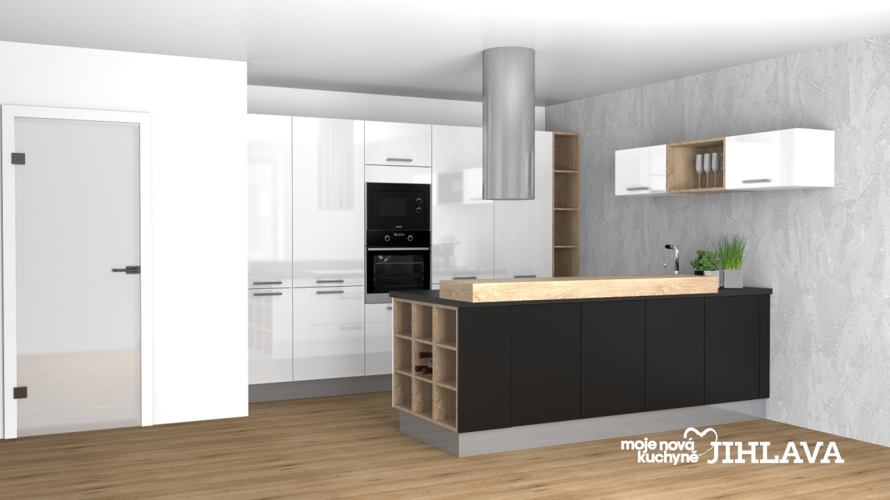 Boční vysoké skříně na stěně v dekoru bílý lesk, kde se nachází vestavné spotřebiče, potravinové a úložné skříně a otevřený regál z dřevodekoru Dub Sonoma, který se prolíná i na ostrůvek v podobě suché vinotéky z boku ostrůvku, barové desky 10 cm a otevřeného regálu 60 cm mezi horními skříněmi.