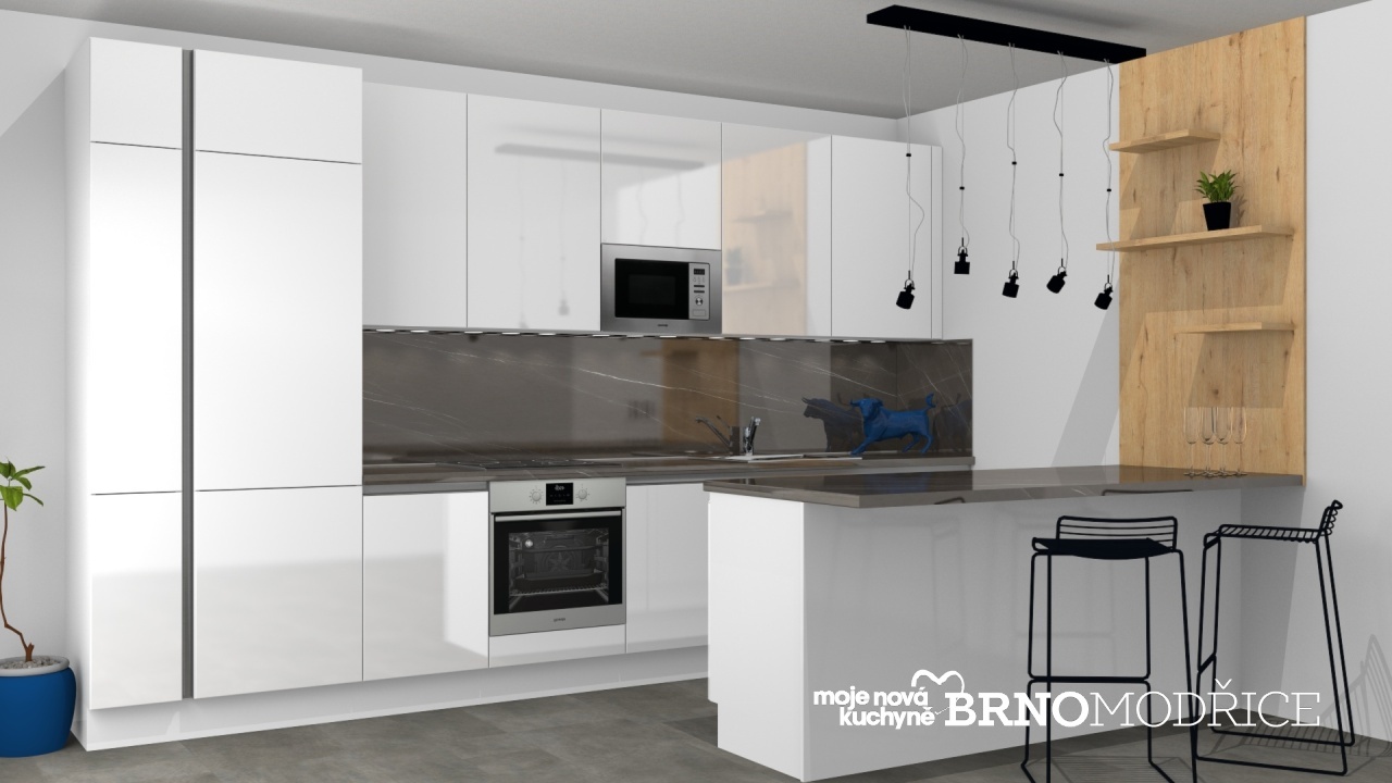 Ostrůvek slouží jako pracovní plocha a zároveň má povytaženou pracovní desku pro pohodlné posezení. Pro oživení bílé kuchyně je u ostrůvku vytažená deska ke stropu s otevřenými policemi v dřevodekoru Dub písek.