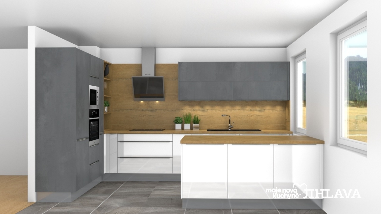 SusannLesklá bílá v kombinaci s divokým dubem a betonem antracit