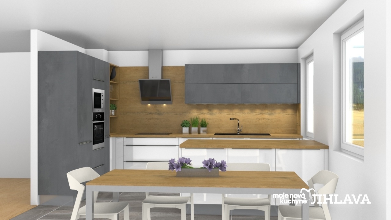 Kuchyně, kde se vše podstatné včetně vaření odehrává na jedné straně a ostrůvek slouží pouze jako pracovní plocha a úložné prostory. Vysoké a horní skříně jsou v provedení antracitového betonu, pracovní stejně jako stolová deska s obkladovým panelem jsou v dekoru dubu divokého a spodní dvířka s ostrůvkem jsou bíle lakované do vysokého lesku. Nasazená úchytka typu Nella je nenápadná a tím, že není zasáhnuto do plochy dveří jsou dvířka i snadno omyvatelná.
