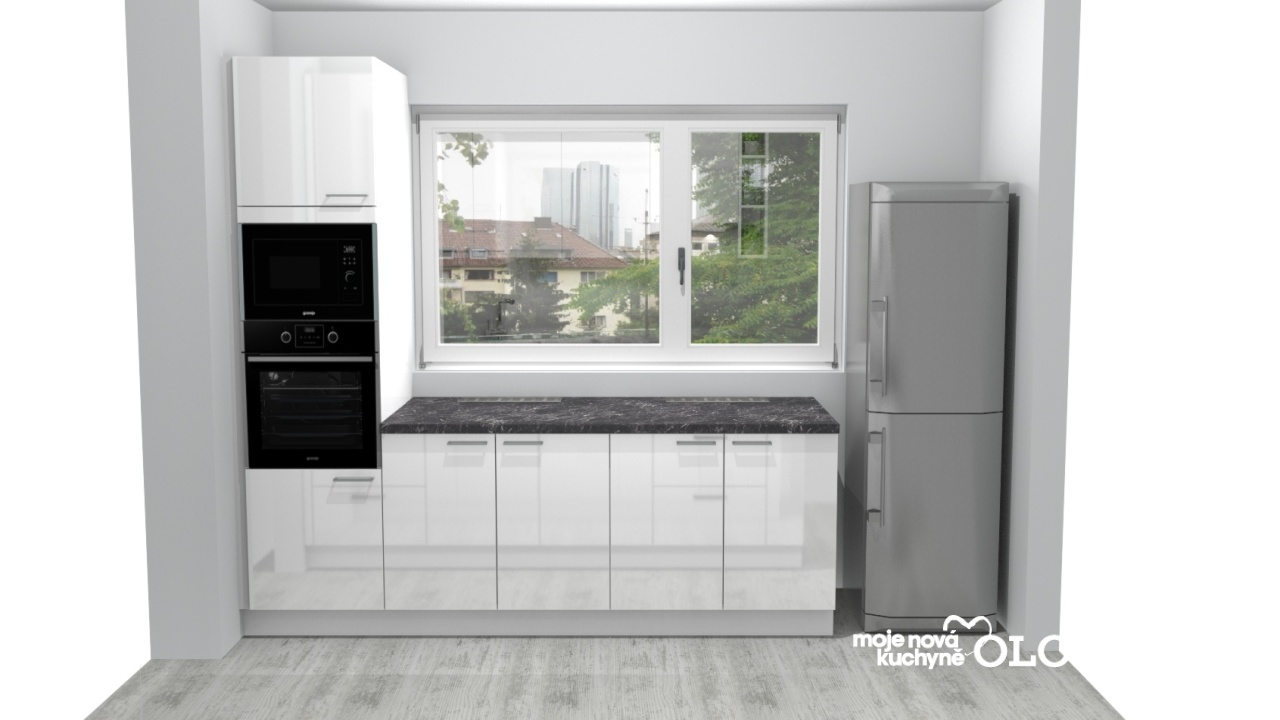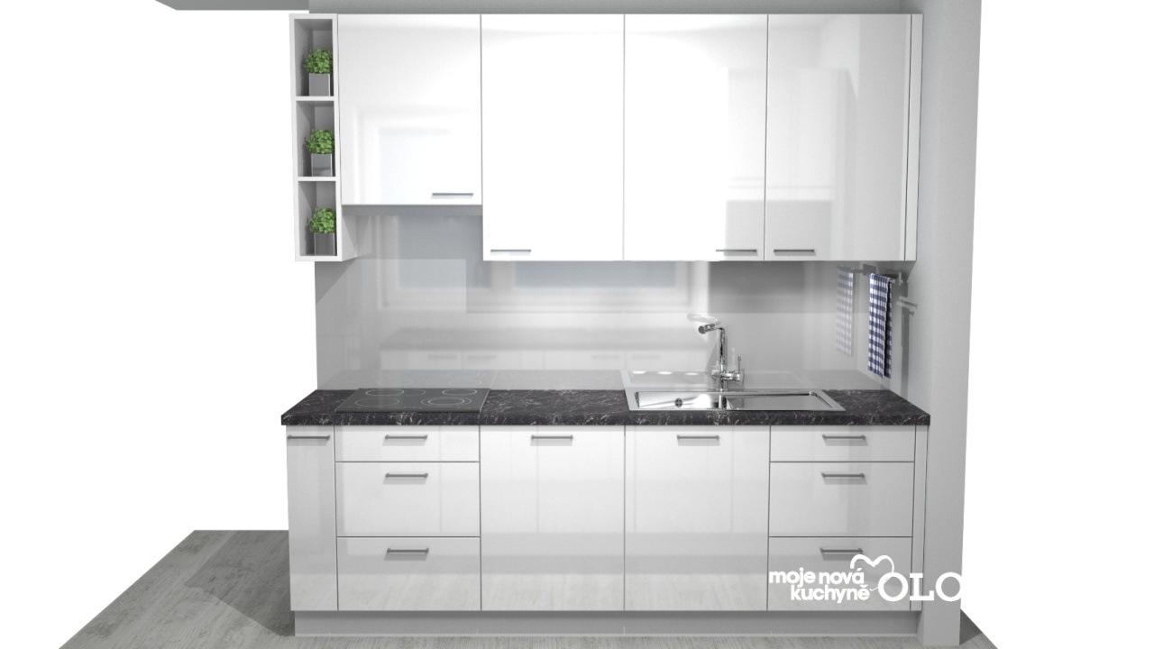 Moderní bílá lesklá kuchyně Susann do panelákové bytu.