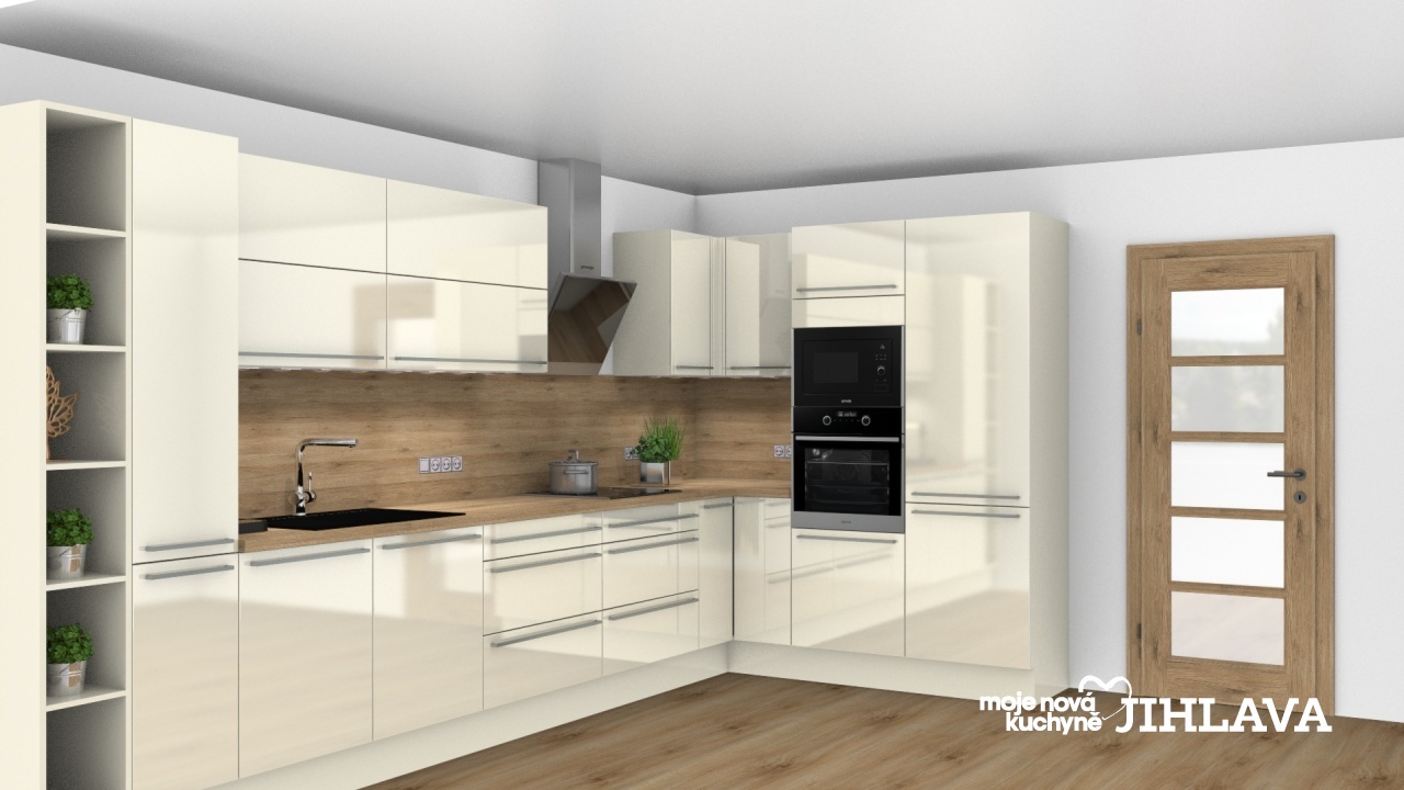 Oblíbená kombinace krémové lesklé Susann spolu s dřevěnou deskou a obkladem Dub Zlatý od české firmy Polyform.